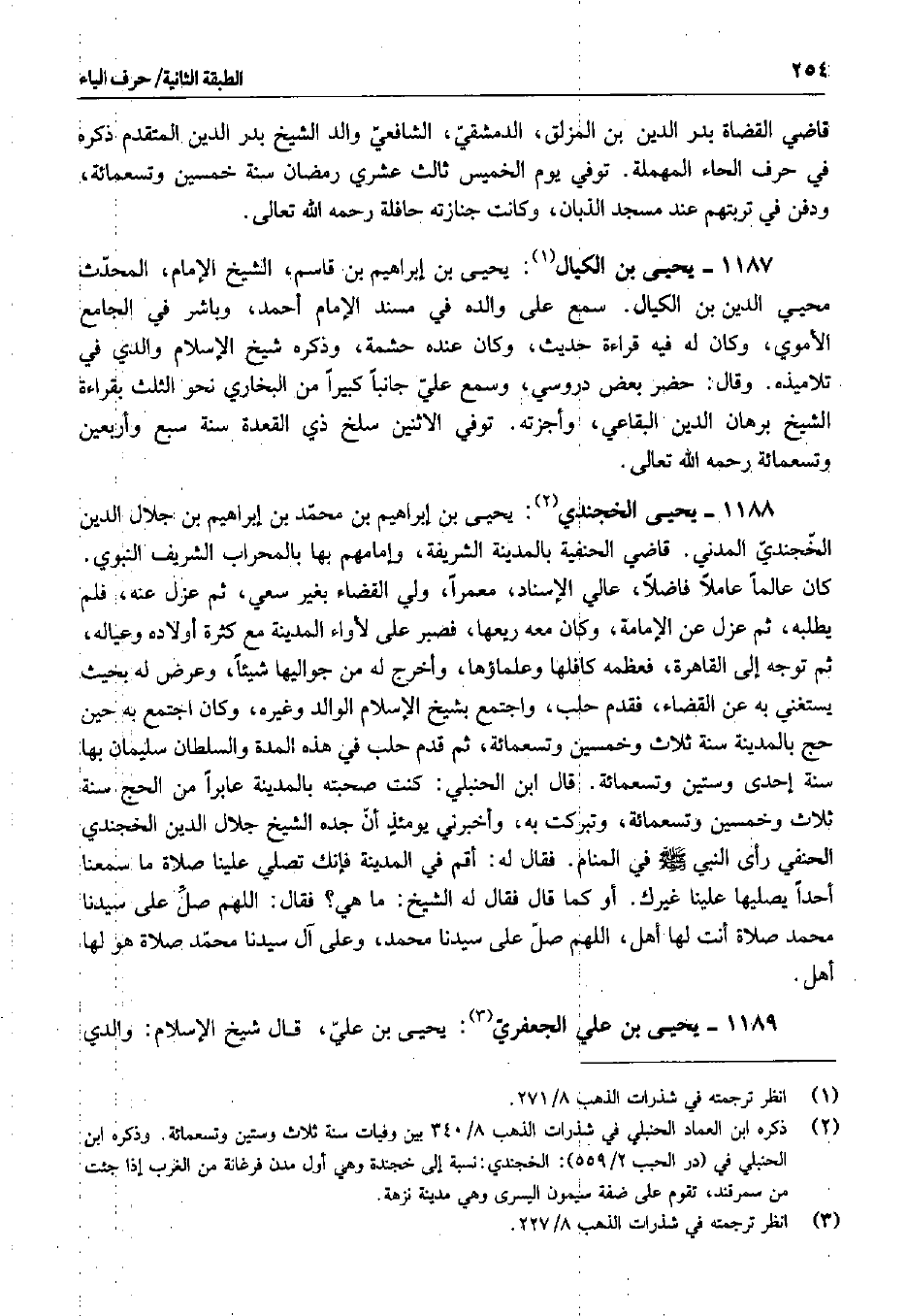 يحيى بن إبراهيم بن محمد بن إبراهيم بن جلال الدين الخجندي المدني. قاضي الحنفية بالمدينة الشريفة، وإمامهم بها بالمحراب الشريف النبوي. كان عالماً عاملاً فاضلاً، عالي الإسناد، معمراً، ولي القضاء بغير سعي، ثم عزل عنه، فلم يطلبه، ثم عزل عن الإمامة، وكان معه ريعها، فصبر على لأواء المدينة مع كثرة أولاده وعياله، ثم توجه إلى القاهرة، فعظمه كافلها وعلماؤها، وأخرج له من جواليها شيئاً، وعرض له بحيث يستغني به عن القضاء، فقدم حلب، واجتمع بشيخ الإسلام الوالد وغيره، وكان اجتمع به حين حج بالمدينة سنة ثلاث وخمسين وتسعمائة، ثم قدم حلب في هذه المدة والسلطان سليمان بها سنة إحدى وستين وتسعمائة. قال ابن الحنبلي: كنت صحبته بالمدينة عابراً من الحج سنة ثلاث وخمسين وتسعمائة، وتبركت به، وأخبرني يومئذ أن جده الشيخ جلال الدين الخجندي الحنفي رأى النبي صلى الله عليه وسلم في المنام. فقال له: أقم في المدينة فإنك تصلي علينا صلاة ما سمعنا أحداً يصليها علينا غيرك. أو كما قال فقال له الشيخ: ما هي. فقال: اللهم صل على سيدنا محمد صلاة أنت لها أهل، اللهم صل على سيدنا محمد، وعلى آل سيدنا محمد صلاة هو لها أهل.