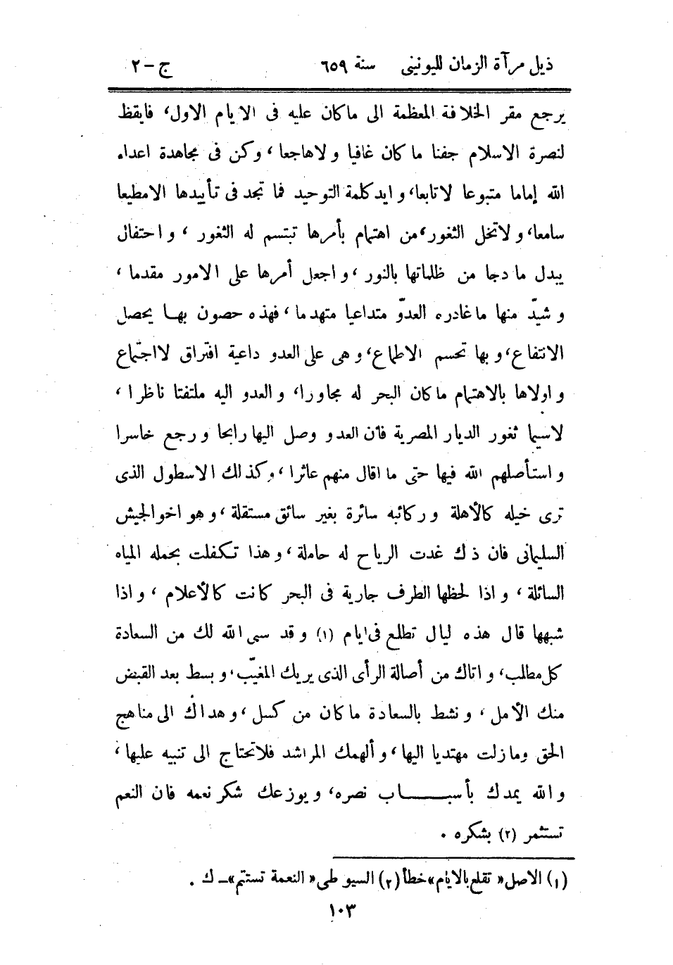 يرجع مقر الخلافة المعظمة إلى ما كان عليه في الأيام الأول، فأيقظ لنصرة الإسلام جفناً ما كان غافياً ولا هاجعاً، وكن في مجاهدة أعداء الله إماماً متبوعاً لا تابعاً، وأيد كلمة التوحيد فما تجد في تأييدها إلا مطيعاً سامعاً، ولا تخل الثغور، من اهتمام بأمرها تبتسم له الثغور، واحتفال يبدل ما دجا من ظلماتها بالنور، واجعل أمرها على الأمور مقدماً، وشيد منها ما غادره العدو متداعياً متهدماً، فهذه حصون بها يحصل الانتفاع، وبها تحسم الأطماع، وهي على العدو داعية افتراق لا اجتماع وأولاها بالاهتمام ما كان البحر له مجاوراُ، والعدو إليه ملتفتاً ناظراً، لا سيما ثغور الديار المصرية فإن العدو وصل إليها رابحاً ورجع خاسراً واستأصلهم الله فيها حتى ما أقال منهم عاثراً، وكذلك الأسطول الذي ترى خيله كالأهلة وركائبه سائرة بغير سائق مستقلة، وهو أخو الجيش السليماني فإن ذك غدت الرياح له حاملة، وهذا تكفلت بحمله المياه السائلة، وإذا لحظها الطرف جارية في البحر كانت كالأعلام، وإذا شبهها قال هذه ليال تطلع في أيام وقد سبى الله لك من السعادة كل مطلب، وأتاك من أصالة الرأس الذي يريك المغيب، وبسط بعد القبض منك الأمل، ونشط بالسعادة ما كان من كسل، وهداك إلى مناهج الحق وما زلت مهتدياً إليها، وألهمك المراشد فلا تحتاج إلى تنبيه عليها، والله يمدك بأسباب نصره، ويوزعك شكر نعمه فإن النعم تستثمر بشكره.