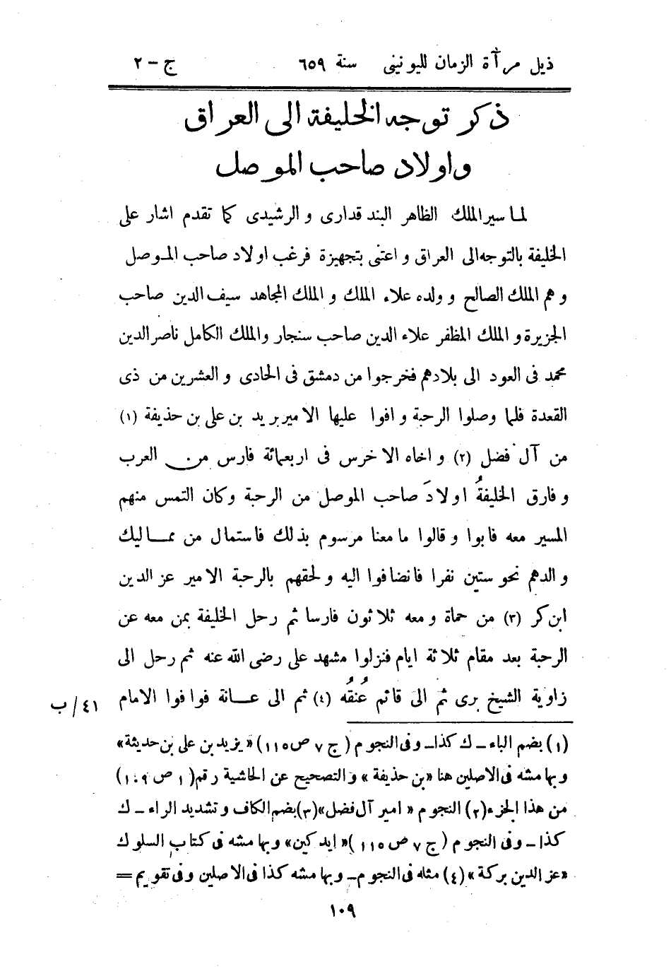 لما سير الملك الظاهر البند قداري والرشيدي كما تقدم أشار على الخليفة بالتوجه إلى العراق واعتنى بتجهيزة فرغب أولاد صاحب الموصل وهم الملك الصالح وولده علاء الملك والملك المجاهد سيف الدين صاحب الجزيرة والملك المظفر علاء الدين صاحب سنجار والملك الكامل ناصر الدين محمد في العود إلى بلادهم فخرجوا من دمشق في الحادي والعشرين من ذي القعدة فلما وصلوا الرحبة وافوا عليها الأمير بريد بن علي بن حذيفة من آل فضل وأخاه الأخرس في أربعمائة فارس من العرب وفارق الخليفة أولاد صاحب الموصل من الرحبة وكان التمس منهم المسير معه فأبوا وقالوا ما معناه مرسوم بذلك فاستمال من مماليك والدهم نحو ستين نفراً فانضافوا إليه ولحقهم بالرحبة الأمير عز الدين ابن كر من حماة ومعه ثلاثون فارساً ثم رحل الخليفة بمن معه عن الرحبة بعد مقام ثلاثة أيام فنزلوا مشهد علي رضي الله عنه ثم رحل إلى زاوية الشيخ بري ثم إلى قائم عنقه ثم إلى عانة فوافوا الإمام