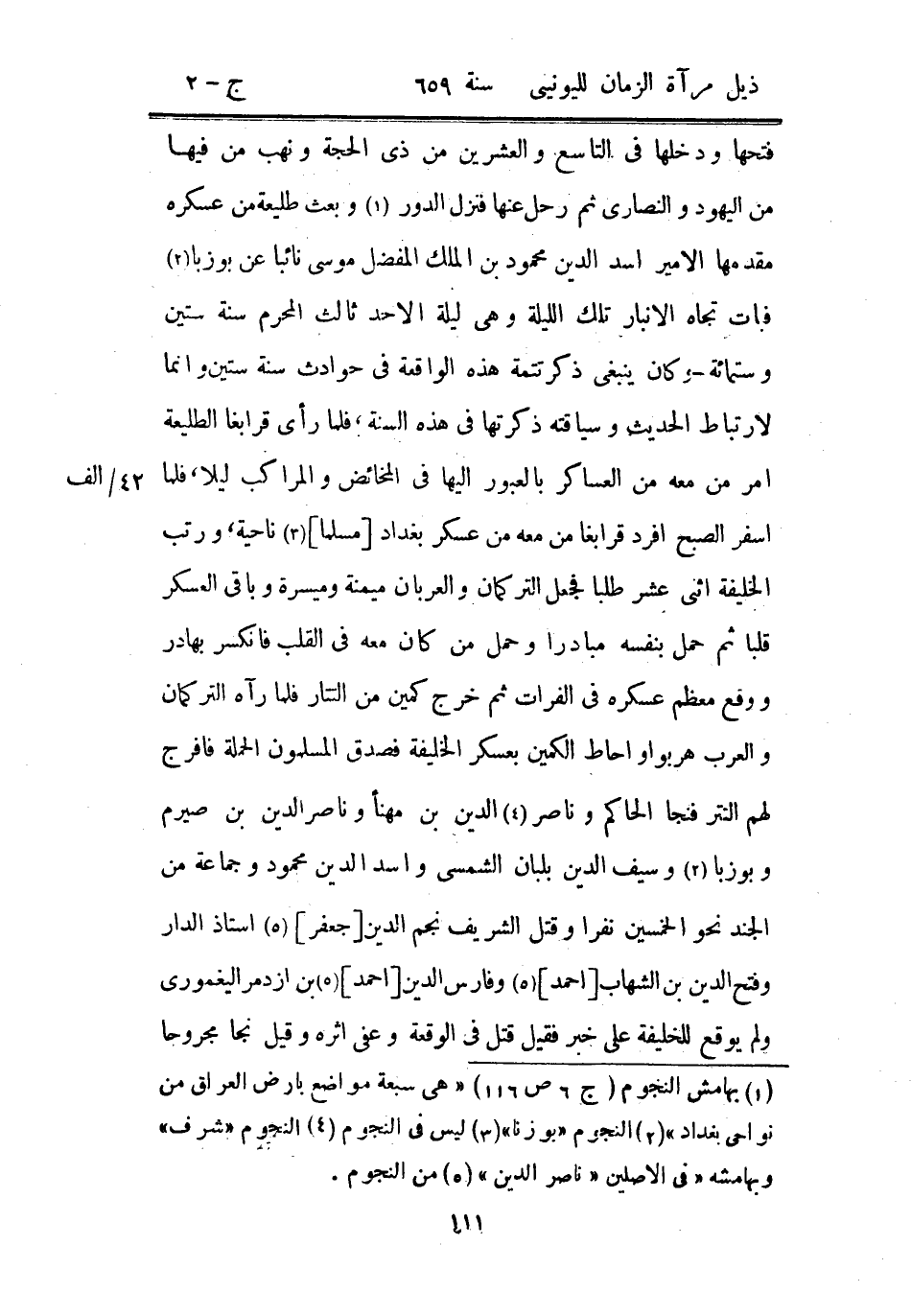 فتحها ودخلها في التاسع والعشرين من ذي الحجة ونهب من فيها من اليهود والنصارى ثم رحل عنها فنزل الدور وبعث طليعة من عسكره مقدمها الأمير أسد الدين محمود بن الملك المفضل موسى نائباً عن بوزبا فبات تجاه الأنبار تلك الليلة وهي ليلة الأحد ثالث المحرم سنة ستين وستمائة وكان ينبغي ذكر تتمة هذه الواقعة في حوادث سنة ستين وإنما لارتباط الحديث وسياقته ذكرتها في هذه السنة، فلما رأى قرابغا الطليعة أمر من معه من العساكر بالعبور إليها في المخائض والمراكب ليلاً، فلما أسفر الصبح أفرد قرابغا من معه من عسكر بغداد مسلماً ناحية، ورتب الخليفة اثنى عشر طلباً فجعل التركمان والعربان ميمنة وميسرة وباقي العسكر قلباً ثم حمل بنفسه مبادراً وحمل من كان معه في القلب فانكسر بهادر ووقع معظم عسكره في الفرات ثم خرج كمين من التتار فلما رآه التركمان والعرب هربوا وأحاط الكمين بعسكر الخليفة فصدق المسلمون الحملة فأفرج لهم التتر فنجا الحاكم وناصر الدين بن مهنا وناصر الدين بن صيرم وبوزبا وسيف الدين بلبان الشمسي وأسد الدين محمود وجماعة من الجند نحو الخمسين نفراً وقتل الشريف نجم الدين جعفر أستاذ الدار وفتح الدين بن الشهاب أحمد وفارس الدين أحمد بن ازدمر اليغموري ولم يوقع للخليفة على خبر فقيل قتل في الوقعة وعفى أثره وقيل نجا مجروحاً