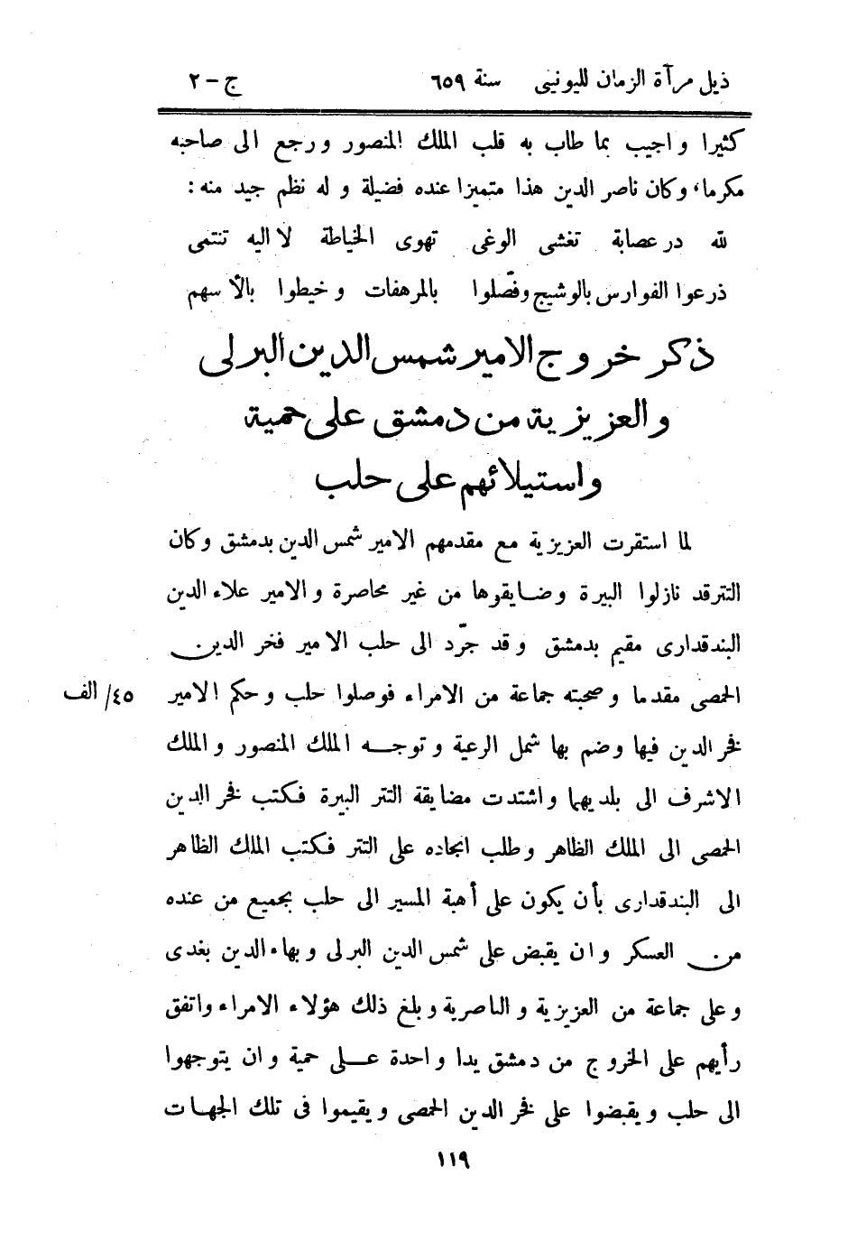 لما استقرت العزيزية مع مقدمهم الأمير شمس الدين بدمشق وكان التتر قد نازلوا البيرة وضايقوها من غير محاصرة والأمير علاء الدين البندقداري مقيم بدمشق وقد جرد إلى حلب الأمير فخر الدين الحمصي مقدماً وصحبته جماعة من الأمراء فوصولا حلب وحكم الأمير فخر الدين فيها وضم بها شمل الرعية وتوجه الملك المنصور والملك الأشرف إلى بلديهما واشتدت مضايقة التتر البيرة فكتب فخر الدين الحمصي إلى الملك الظاهر وطلب إيجاده على التتر فكتب الملك الظاهر إلى البندقداري بأن يكون على أهبة المسير إلى حلب بجميع من عنده من العسكر وأن يقبض على شمس الدين البرلي وبهاء الدين بغدي وعلى جماعة من العزيزية والناصرية وبلغ ذلك هؤلاء الأمراء واتفق رأيهم على الخروج من دمشق يداً واحدة على حمية وإن يتوجهوا إلى حلب ويقبضوا على فخر الدين الحمصي ويقيموا في تلك الجهات