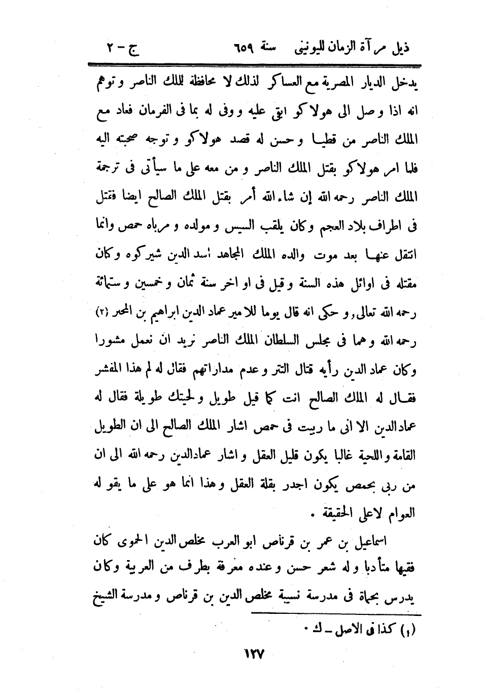 يدخل الديار المصرية مع العساكر لذلك لا محافظة للملك الناصر وتوهم أنه إذا وصل إلى هولاكو أبقى عليه ووفى له بما في الفرمان فعاد مع الملك الناصر من قطيا وحسن له قصد هولاكو وتوجه صحبته إليه فلما أمر هولاكو بقتل الملك الناصر ومن معه على ما سيأتي في ترجمة الملك الناصر رحمه الله إن شاء الله أمر بقتل الملك الصالح أيضاً فقتل في أطراف بلاد العجم وكان يلقب السيس ومولده ومرباه حمص وإنما انتقل عنها بعد موت والده الملك المجاهد أسد الدين شيركوه وكان مقتله في أوائل هذه السنة وقيل في أواخر سنة ثمان وخمسين وستمائة رحمه الله تعالى وحكي أنه قال يوماً للأمير عماد الدين إبراهيم بن المحبر رحمه الله وهما في مجلس السلطان الملك الناصر نريد أن نعمل مشوراً وكان عماد الدين رأيه قتال التتر وعدم مداراتهم فقال له لم هذا المفشر فقال له الملك الصالح أنت كما قيل طويل ولحيتك طويلة فقال له عماد الدين ألا أني ما ربيت في حمص أشار الملك الصالح إلى أن الطويل القامة واللحية غالباً يكون قليل العقل وأشار عماد الدين رحمه الله إلى أن من ربى بحمص يكون أجدر بقلة العقل وهذا إنما هو على ما يقوله العوام لا على الحقيقة.