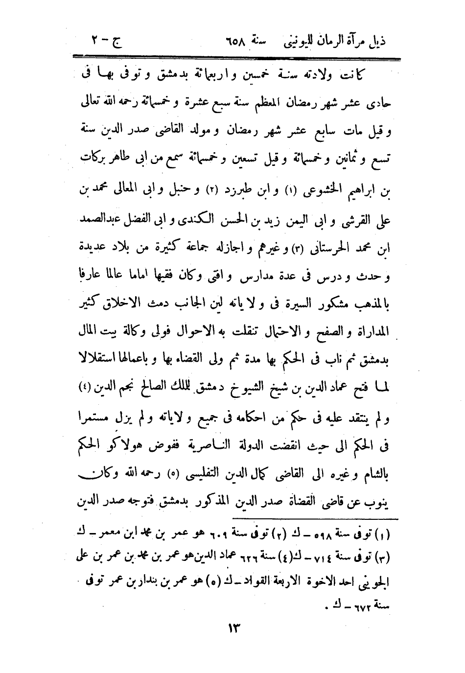 كانت ولادته سنة خمسين وأربعمائة بدمشق وتوفي بها في حادي عشر شهر رمضان المعظم سنة سبع عشرة وخمسمائة رحمه الله تعالى وقيل مات سابع عشر شهر رمضان ومولد القاضي صدر الدين سنة تسع وثمانين وخمسمائة وقيل تسعين وخمسمائة سمع من أبي طاهر بركات بن إبراهيم الخشوعي وابن طبرزد وحنبل وأبي المعالي محمد بن علي القرشي وأبي اليمن زيد بن الحسن الكندي وأبي الفضل عبد الصمد ابن محمد الحرستاني وغيرهم وأجاز له جماعة كثيرة من بلاد عديدة وحدث ودرس في عدة مدارس وأفتى وكان فقيهاً إماماً عالماً عارفاً بالمذهب مشكور السيرة في ولاياته لين الجانب دمث الأخلاق كثير المداراة والصفح والاحتمال تنقلت به الأحوال فولى وكالة بيت المال بدمشق ثم ناب في الحكم بها مدة ثم ولي القضاء بها وبأعمالها استقلالاً لما فتح عماد الدين بن شيخ الشيوخ دمشق للملك الصالح نجم الدين ولم ينتقد عليه في حكم من أحكامه في جميع ولاياته ولم يزل مستمراً في الحكم إلى حيث انقضت الدولة الناصرية ففوض هولاكو الحلم بالشام وغيره إلى القاضي كمال الدين التفليسي رحمه الله وكان ينوب عن قاضي القضاة صدر الدين المذكور بدمشق فتوجه صدر الدين