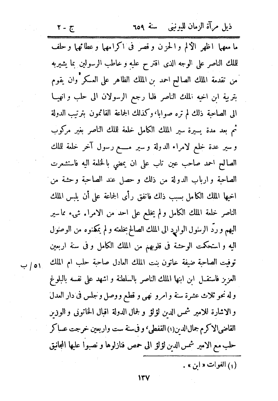 ما معهما أظهر الألم والحزن وقصر في إكرامهما وعطائهما وحلف للملك الناصر على الوجه الذي اقترح عليه وخاطب الرسولين بما يشير به من تقدمة الملك الصالح أحمد بن الملك الظاهر على العسكر وإن يقوم بتربية ابن أخيه الملك الناصر فلما رجع الرسولان إلى حلب وأنهيا إلى الصاحبة ذلك لم تره صوابا، وكذلك الجماعة القائمون بترتيب الدولة ثم بعد مدة يسيرة سير الملك الكامل خلعة للملك الناصر بغير مركوب وسير عدة خلع لأمراء الدولة وسير مع رسول آخر خلعة للملك الصالح أحمد صاحب عين تاب على أن يمضي بالخلعة إليه فاستشعرت الصاحبة وأرباب الدولة من ذلك وحصل عند الصاحبة وحشة من أخيها الملك الكامل بسبب ذلك فاتفق رأي الجماعة على أن يلبس الملك الناصر خلعة الملك الكامل ولم يخلع على أحد من الأمراء شيء مما سير إليهم ورد الرسول الوارد إلى الملك الصالح بخلعته ولم يمكنوه من الوصول إليه واستحكمت الوحشة في قلوبهم من الملك الكامل وفي سنة أربعين توفيت الصاحبة ضيفة خاتون بنت الملك العادل صاحبة حلب أم الملك العزيز فاستقل ابن ابنها الملك الناصر بالسلطنة وأشهد على نفسه بالبلوغ وله نحو ثلاث عشرة سنة وأمر ونهى وقطع ووصل وجلس في دار العدل والإشارة للأمير شمس الدين لؤلؤ ولجمال الدولة إقبال الخاتوني والوزير القاضي الأكرم جمال الدين القفطي، وفي سنة ست وأربعين خرجت عساكر حلب مع الأمير شمس الدين لؤلؤ إلى حمص فنازلوها ونصبوا عليها المجانيق