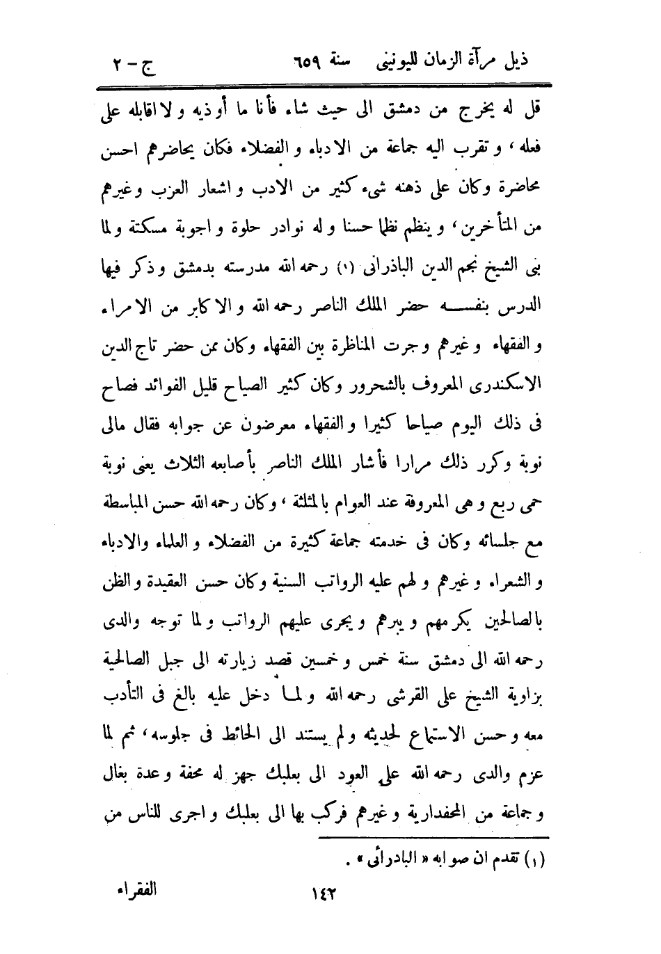 قل له يخرج من دمشق إلى حيث شاء فأنا ما أوذيه ولا أقابله على فعله، وتقرب إليه جماعة من الأدباء والفضلاء فكان يحاضرهم أحسن محاضرة وكان على ذهنه شيء كثير من الأدب وأشعار العرب وغيرهم من المتأخرين، وينظم نظماً حسناً وله نوادر حلوة وأجوبة مسكتة ولما بنى الشيخ نجم الدين الباذراني رحمه الله مدرسته بدمشق وذكر فيها الدرس بنفسه حضر الملك الناصر رحمه الله والأكابر من الأمراء والفقهاء وغيرهم وجرت المناظرة بين الفقهاء، وكان ممن حضر تاج الدين الإسكندري المعروف بالشحرور وكان كثير الصياح قليل الفوائد فصاح في ذلك اليوم صياحاً كثيراً والفقهاء معرضون عن جوابه فقال مالي نوبة وكرر ذلك مراراً فأشار الملك الناصر بأصابعه الثلاث يعني نوبة حمى ربع وهي المعروفة عند العوام بالمثلثة، وكان رحمه الله حسن المباسطة مع جلسائه وكان في خدمته جماعة كثيرة من الفضلاء والعلماء والأدباء والشعراء وغيرهم ولهم عليه الرواتب السنية وكان حسن العقيدة والظن بالصالحين يكرمهم ويبرهم ويجري عليهم الرواتب ولما توجه والدي رحمه الله إلى دمشق سنة خمس وخمسين قصد زيارته إلى جبل الصالحية بزاوية الشيخ علي القرشي رحمه الله ولما دخل عليه بالغ في التأدب معه وحسن الاستماع لحديثه ولم يستند إلى الحائط في جلوسه، ثم لما عزم والدي رحمه الله على العود إلى بعلبك جهز له محفة وعدة بغال وجماعة من المحفدارية وغيرهم فركب بها إلى بعلبك وأجرى للناس من