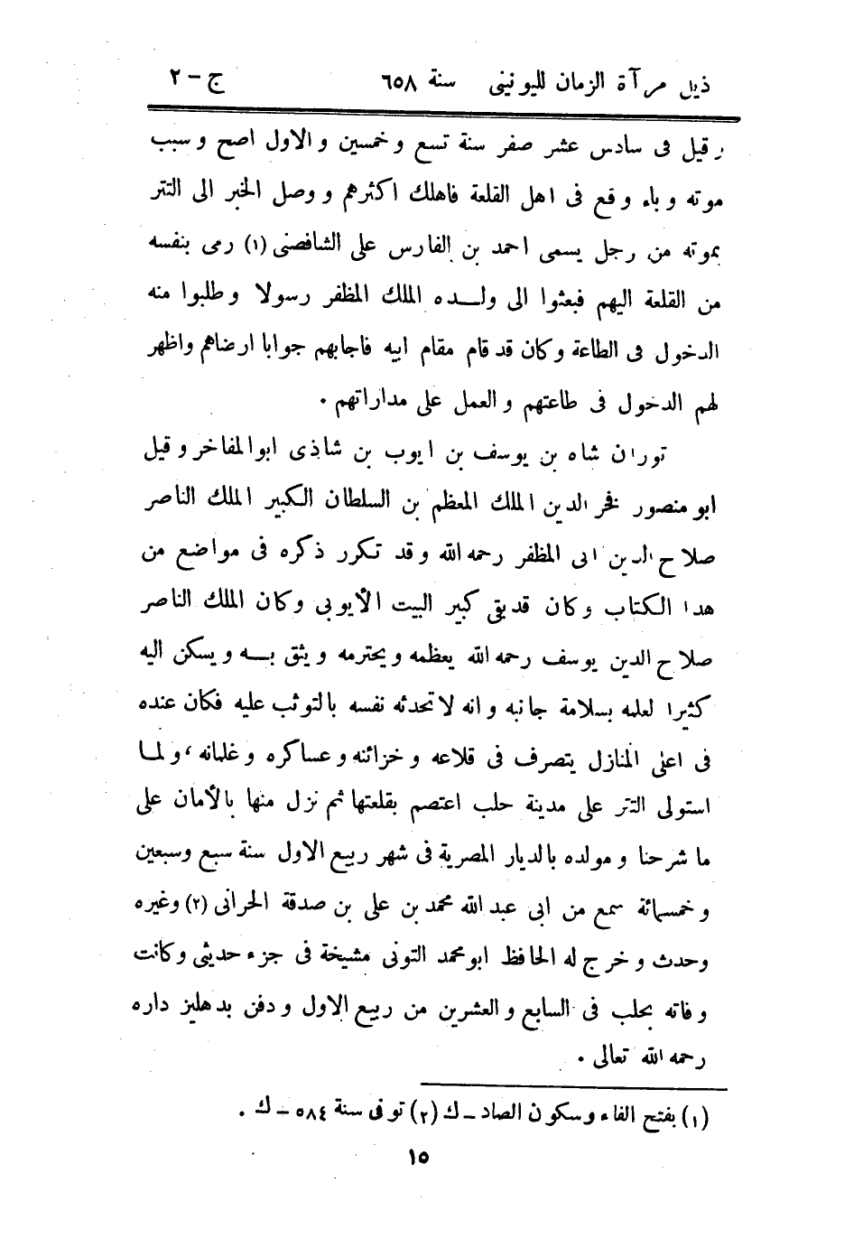 وقيل في سادس عشر صفر سنة تسع وخمسين والأول أصح وسبب موته وباء وقع في أهل القلعة فأهلك أكثرهم ووصل الخبر إلى التتر بموته من رجل يسمى أحمد بن الفارس علي الشافصني رمى بنفسه من القلعة إليهم فبعثوا إلى ولده الملك المظفر رسولاً وطلبوا منه الدخول في الطاعة وكان قد قام مقام أبيه فأجابهم جواباً أرضاهم وأظهر لهم الدخول في طاعتهم والعمل على مداراتهم.