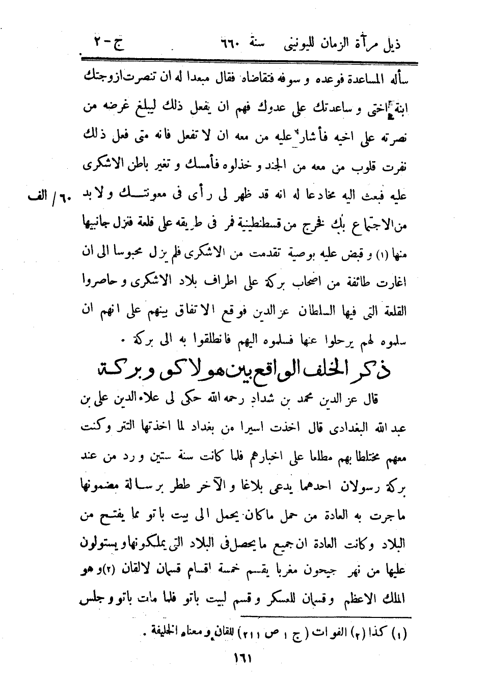 قال عز الدين محمد بن شداد رحمه الله حكى لي علاء الدين علي بن عبد الله البغدادي قال أخذت أسيراً من بغداد لما أخذتها التتر وكنت معهم مختلطاً بهم مطلعاً على أخبارهم فلما كانت سنة ستين ورد من عند بركة رسولان أحدهما يدعى بلاغا والآخر ططر برسالة مضمونها ما جرت به العادة من حمل ما كان يحمل إلى بيت باتو مما يفتح من البلاد وكانت العادة أن جميع ما يحصل في البلاد التي يملكونها ويستولون عليها من نهر جيحون مغرباً يقسم خمسة أقسام قسمان لا لقان وهو الملك الأعظم وقسمان للعسكر وقسم لبيت باتو فلما مات باتو وجلس