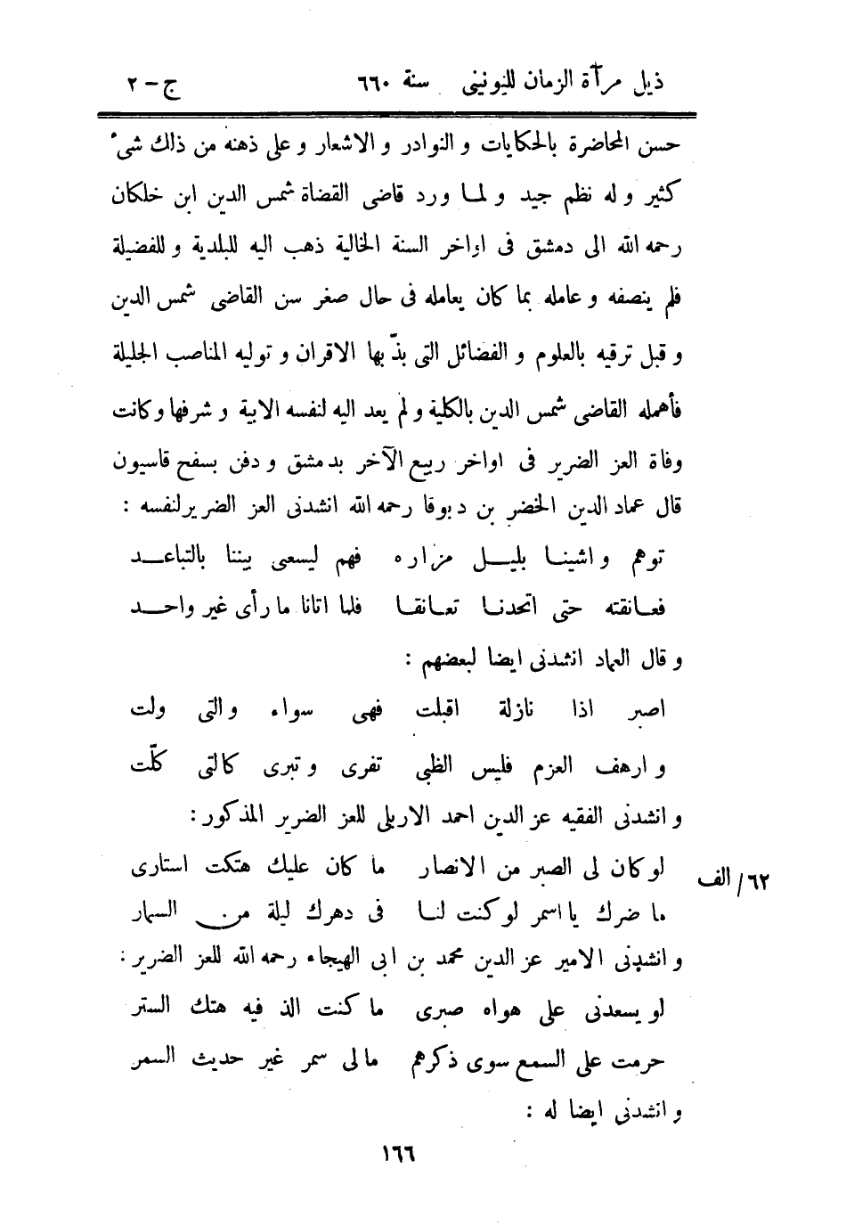 حسن المحاضرة بالحكايات والنوادر والأشعار وعلى ذهنه من ذلك شيء كثير وله نظم جيد ولما ورد قاضي القضاة شمس الدين ابن خلكان رحمه الله إلى دمشق في أواخر السنة الخالية ذهب إليه للبلدية وللفضيلة فيم ينصفه وعامله بما كان يعامله في حال صغر سن القاضي شمس الدين وقبل ترقيه بالعلوم والفضائل التي بذ بها الأقران وتوليه المناصب الجليلة فأهمله القاضي شمس الدين بالكلية ولم يعد إليه لنفسه الأبية وشرفها وكانت وفاة العز الضرير في أواخر ربيع الآخر بدمشق ودفن بسفح قاسيون قال عماد الدين الخضر بن دبوقا رحمه الله أنشدني العز الضرير لنفسه: