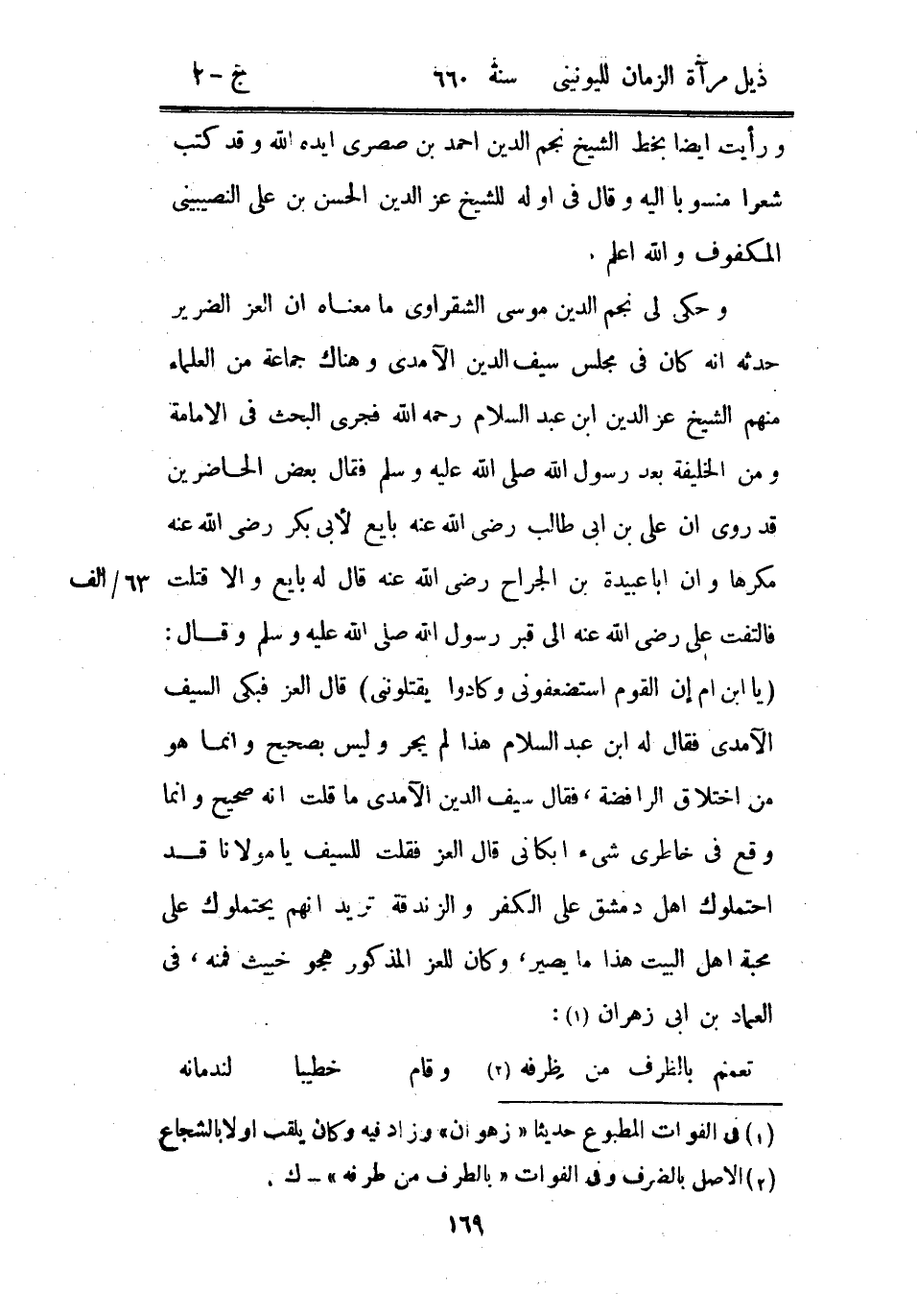 وحكى لي نجم الدين موسى الشقراوي ما معناه أن العز الضرير حدثه أنه كان في مجلس سيف الدين الآمدي وهناك جماعة من العلماء منهم الشيخ عز الدين ابن عبد السلام رحمه الله فجري البحث في الإمامة ومن الشيخ عز الدين ابن عبد السلام رحمه الله فجرى البحث في الإمامة ومن الخليفة بعد رسول الله صلى الله عليه وسلم فقال بعض الحاضرين قد روى أن علي بن أبي طالب رضي الله عنه بايع لأبي بكر رضي الله عنه مكرهاً وإن أبا عبيدة بن الجراح رضي الله عنه قال له بايع وإلا قتلت فالتفت على رضى الله عنه إلى قبر رسول الله صلى الله عليه وسلم وقال: " يا ابن أم إن القوم استضعفوني وكادوا يقتلونني " قال العز فبكى السيف الآمدي فقال له ابن عبد السلام هذا لم يجر وليس بصحيح وإنما هو من اختلاق الرافضة، فقال سيف الدين الآمدي ما قلت أنه صحيح وإنما وقع في خاطري شيء أبكاني قال العز فقلت للسيف يا مولانا قد احتملوك أهل دمشق على الكفر والزندقة تريد انهم يحتملوك على محبة أهل البيت هذا ما يصير، وكان للعز المذكور هجو خبيث فمنه، في العماد بن أبي زهران: