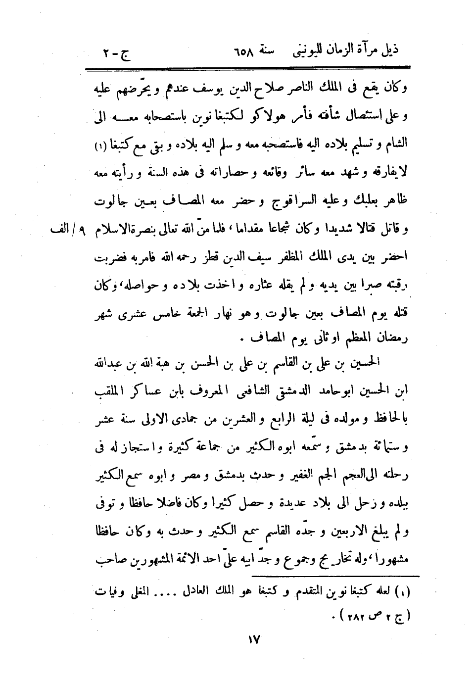 وكان يقع في الملك الناصر صلاح الدين يوسف عندهم ويحرضهم عليه وعلى استئصال شأفته فأمر هولاكو لكتبغا نوين باستصحابه معه إلى الشام وتسليم بلاده إليه فاستصحبه معه وسلم إليه بلاده وبقي مع كتبغا لا يفارقه وشهد معه سائر وقائعه وحصاراته في هذه السنة ورأيته معه ظاهر بعلبك وعليه السراقوج وحضر معه المصاف بعين جالوت وقاتل قتالاً شديداً وكان شجاعاً مقداماً، فلما من الله تعالى بنصرة الإسلام أحضر بين يدي الملك المظفر سيف الدين قطز رحمه الله فأمر به فضربت رقبته صبراً بين يديه ولم يقله عثاره وأخذت بلاده وحواصله، وكان قتله يوم المصاف بعين جالوت وهو نهار الجمعة خامس عشري شهر رمضان المعظم أو ثاني يوم المصاف.