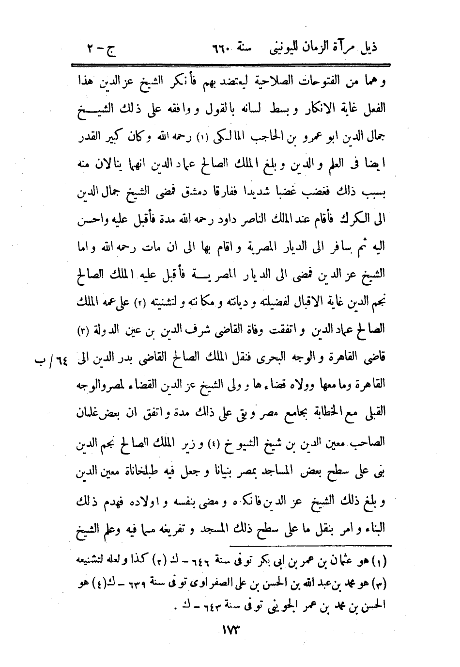 وهما من الفتوحات الصلاحية ليعتضد بهم فأنكر الشيخ عز الدين هذا الفعل غاية الإنكار وبسط لسانه بالقول ووافقه على ذلك الشيخ جمال الدين أبو عمرو بن الحاجب المالكي رحمه الله وكن كبير القدر أيضاً في العلم والدين وبلغ الملك الصالح عماد الدين إنهما ينالان منه بسبب ذلك فغضب غضباً شديداً ففارقا دمشق فمضى الشيخ جمال الدين إلى الكرك فأقام عند الملك الناصر داود رحمه الله مدة فأقبل عليه وأحسن إليه ثم سافر إلى الديار المصرية وأقام بها إلى أن مات رحمه الله وأما الشيخ عز الدين فمضى إلى الديار المصرية فأقبل عليه الملك الصالح نجم الدين غاية الإقبال لفضيلته وديانته ومكانته ولتشنيته على عمه الملك الصالح عماد الدين واتفقت وفاة القاضي شرف الدين بن عين الدولة قاضي القاهرة والوجه البحري فنقل الملك الصالح القاضي بدر الدين إلى القاهرة وما معها وولاه قضاءها وولى الشيخ عز الدين القضاء لمصر والوجه القبلي مع الخطابة بجامع مصر وبقي على ذلك مدة واتفق أن بعض غلمان الصاحب معين الدين بن شيخ الشيوخ وزير الملك الصالح نجم الدين بنى على سطح بعض المساجد بمصر بنياناً وجعل فيه طبلخاناة معين الدين وبلغ ذلك الشيخ عز الدين فأنكره ومضى بنفسه وأولاده فهدم ذلك البناء وأمر بنقل ما على سطح ذلك المسجد وتفريغه مما فيه وعلم الشيخ