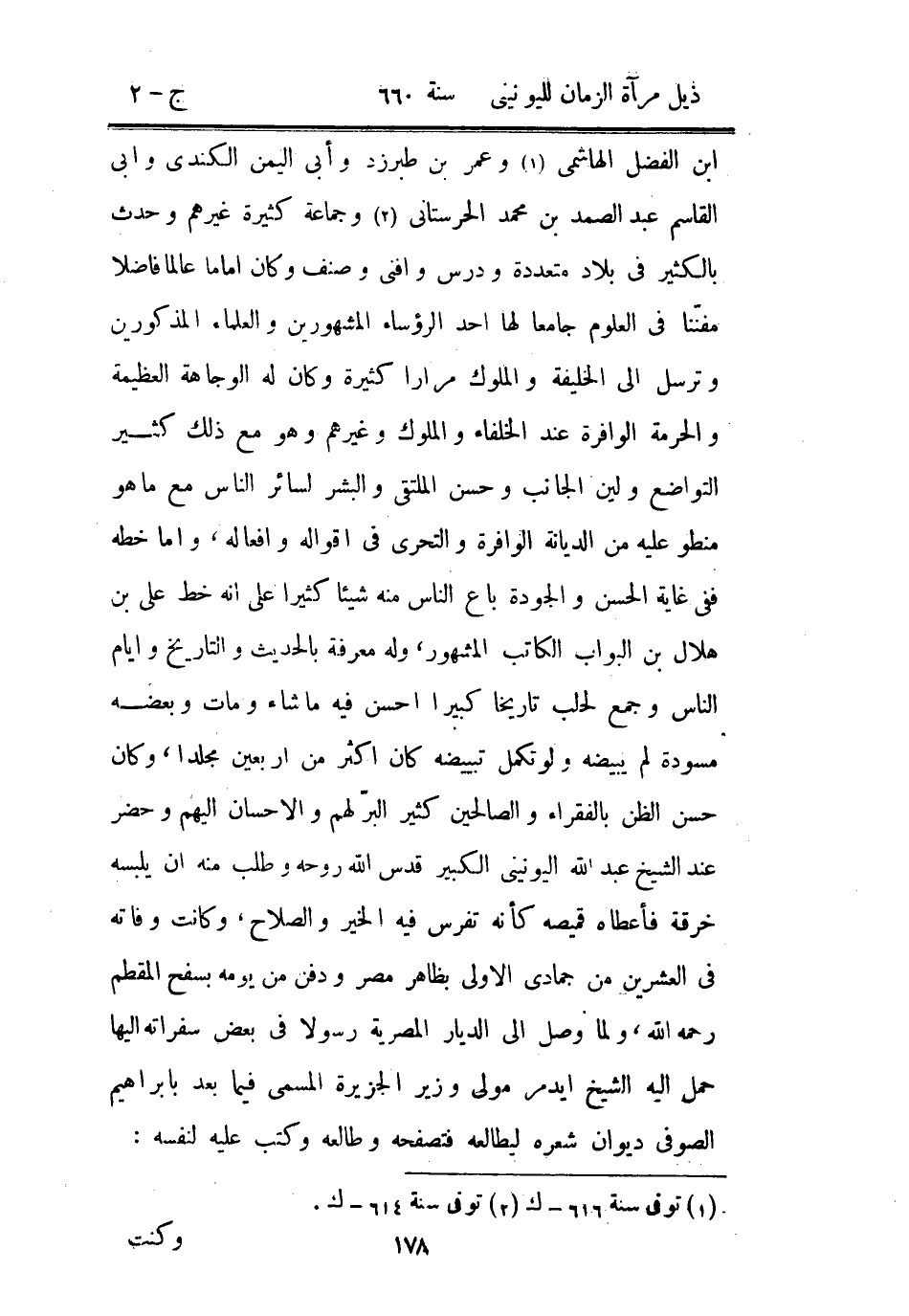 ابن الفضل الهاشمي وعمر بن طبرزد وأبي اليمن الكندي وأبي القاسم عبد الصمد بن محمد الحرستاني وجمعة كثرة غيرهم وحدث بالكثير في بلاد متعددة ودرس وأفنى وصنف وكان إماماً عالماً فاضلاً مفنناً في العلوم جامعاً لها أحد الرؤساء المشهورين والعلماء المذكورين وترسل إلى الخليفة والملوك مراراً كثيرة وكان له الوجاهة العظيمة والحرمة الوافرة عند الخلفاء والملوك وغيرهم وهو مع الوجاهة العظيمة والحرمة الوافرة عند الخلفاء والملوك وغيرهم وهو مع ذلك كثير التواضع ولين الجانب وحسن الملتقى والبشر لسائر الناس مع ما هو منطو عليه من الديانة الوافرة والتحري في أقواله وأفعاله، وأما خطه ففي غاية الحسن والجودة باع الناس منه شيئاً كثيراً على أنه خط علي بن هلال بن البواب الكاتب المشهور، وله معرفة بالحديث والتاريخ وأيام الناس وجمع لحلب تاريخاً كبيراً أحسن فيه ما شاء ومات وبعضه مسودة لم يبيضه ولو تكمل تبييضه كان أكثر من أربعين مجلداً، وكان حسن الظن بالفقراء والصالحين كثير البر لهم والإحسان إليهم وحضر عند الشيخ عبد الله اليونيني الكبير قدس الله روحه وطلب منه أن يلبسه خرقة فأعطاه قميصه كأنه تفرس فيه الخير والصلاح، وكانت وفاته في العشرين من جمادى الأولى بظاهر مصر ودفن من يومه بسفح المقطم رحمه الله، ولما وصل إلى الديار المصرية رسولاً في بعض سفراته إليها حمل إليه الشيخ أيدمر مولى وزير الجزيرة والمسمى فيما بعد بإبراهيم الصوفي ديوان شعره ليطالعه فتصفحه وطالعه وكتب عليه لنفسه:؟