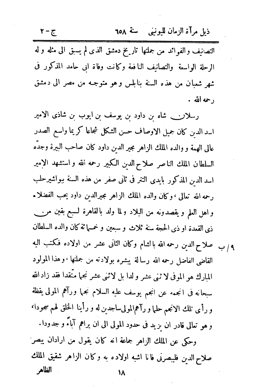رسلان شاه بن داود بن يوسف بن أيوب بن شاذي الأمير أسد الدين كان جميل الأوصاف حسن الشكل شجاعاً كريماً واسع الصدر عالي الهمة ووالده الملك الزاهر مجير الدين داود كان صاحب البيرة وجده السلطان الملك الناصر صلاح الدين الكبير رحمه الله واستشهد الأمير أسد الدين المذكور بأيدي التتر في ثاني صفر من هذه السنة ببواشير حلب رحمه الله تعالى، وكان والده الملك الزاهر مجير الدين داود يحب الفضلاء وأهل العلم ويقصدونه من البلاد ولما ولد بالقاهرة لسبع بقين من ذي القعدة أو ذي الحجة سنة ثلاث وسبعين وخمسمائة كان والده السلطان صلاح الدين رحمه الله بالشام وكان الثاني عشر من أولاده فكتب إليه القاضي الفاضل رحمه الله رسالة يبشره بولادته من جملتها، وهذا المولود المبارك هو الموفى لاثني عشر ولداً بل لاثني عشر نجماً متقداً فقد زاد الله سبحانه في أنجمه عن أنجم يوسف عليه السلام نجماً ورآهم المولى يقظة ورأى تلك الأنجم حلماً ورآهم المولى ساجدين له ورأينا الخلق لهم سجوداً، وهو تعالى قادر أن يزيد في حدود المولى إلى أن يراهم آباء وجدوداً.