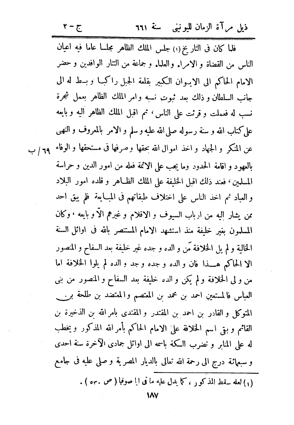 فلما كان في التاريخ جلس الملك الظاهر مجلساً عاماً فيه أعيان الناس من القضاة والأمراء والعلماء وجماعة من التتار الوافدين وحضر الإمام الحاكم إلى الإيوان الكبير بقلعة الجبل راكباً وبسط له إلى جانب السلطان وذلك بعد ثبوت نسبه وأمر الملك الظاهر بعمل شجرة نسب له فعملت وقرئت على الناس، ثم أقبل الملك الظاهر إليه وبايعه على كتاب الله وسنة رسوله صلى الله عليه وسلم والأمر بالمعرف والنهي عن المنكر والجهاد وأخذ أموال الله بحقها وصرفها في مستحقها والوفاء بالعهود وإقامة الحدود وما يجب على الأئمة فعله من أمور الدين وحراسة المسلمين، فعند ذلك أقبل الخليفة على الملك الظاهر وقلده أمور البلاد والعباد ثم أخذ الناس على اختلاف طبقاتهم في المبايعة فلم يبق أحد ممن يشار إليه من أرباب السيوف والأقلام وغيرهم إلا وبايعه، وكان المسلمون بغير خليفة منذ استشهد الإمام المستنصر بالله في أوائل السنة الخالية ولم يل الخلافة من والده وجده غير خليفة بعد السفاح والمنصور إلا الحاكم هذا فإن والده وجده وجد والده لم يلوا الخلافة أما من ولي الخلافة ولم يكن والده خليفة بعد السفاح والمنصور من بني العباس فالمستعين أحمد بن محمد بن المعتصم والمعتضد بن طلحة بن المتوكل والقادر بن أحمد بن المقتدر والمقتدى بأمر الله بن الذخيرة بن القائم وبقي اسم الخلافة على الإمام الحاكم بأمر الله المذكور ويخطب له على المنابر وتضرب السكة باسمه إلى أوائل جمادى الآخرة سنة إحدى وسبعمائة درج إلى رحمة الله تعالى بالديار المصرية وصلى عليه في جامع