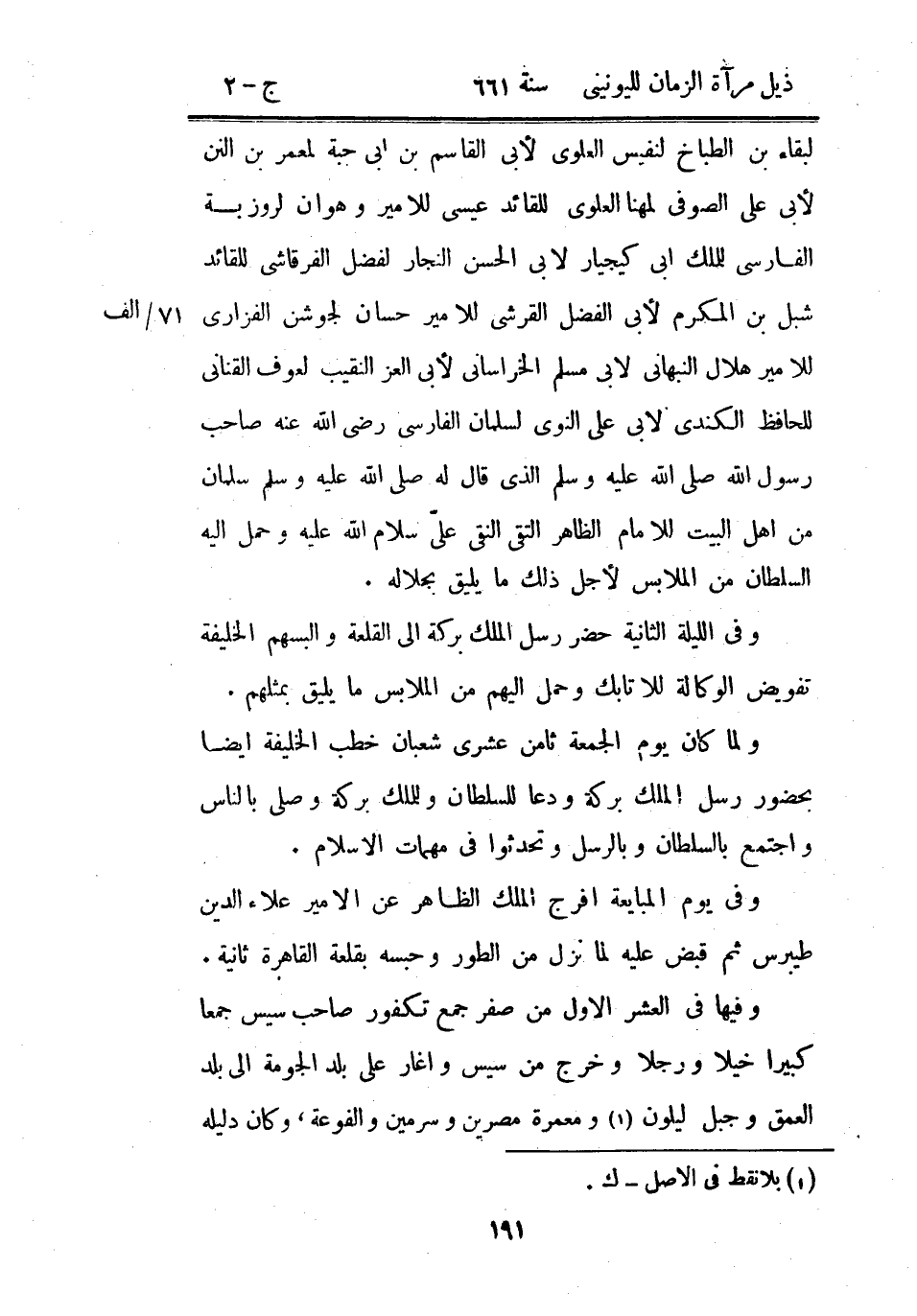 ولما كان يوم الجمعة ثامن عشري شعبان خطب الخليفة أيضاً بحضور رسل الملك بركة ودعا للسلطان وللملك بركة وصلى بالناس واجتمع بالسلطان وللملك بركة وصلى بالناس واجتمع بالسلطان وبالرسل وتحدثوا في مهمات الإسلام.