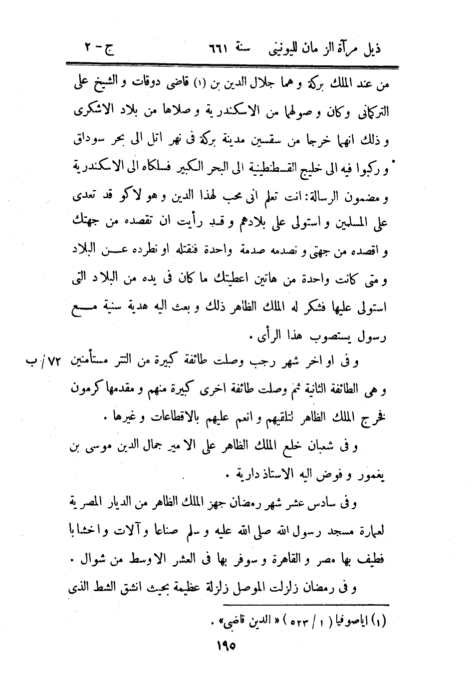 من عند الملك بركة وهما جلال الدين بن قاضي دوقات والشيخ علي التركماني وكان وصولهما من الإسكندرية وصلاها من بلاد الأشكري وذلك أنهما خرجا من سقسين مدينة بكرة في نهر اتل إلى بحر سوداق وركبوا فيه إلى خليج القسطنطينية إلى البحر الكبير فسلكاه إلى الإسكندرية ومضمون الرسالة: أنت تعلم أني محب لهذا الدين وهولاكو قد تعدى على المسلمين واستولى على بلادهم وقد رأيت أن تقصده من جهتك واقصده من جهتي ونصدمه صدمة واحدة فنقتله أو نطرده عن البلاد ومتى كانت واحدة من هاتين أعطيتك ما كان في يده من البلاد التي استولى عليها فشكر له الملك الظاهر ذلك وبعث إليه هدية سنية مع رسول يستصوب هذا الرأي.