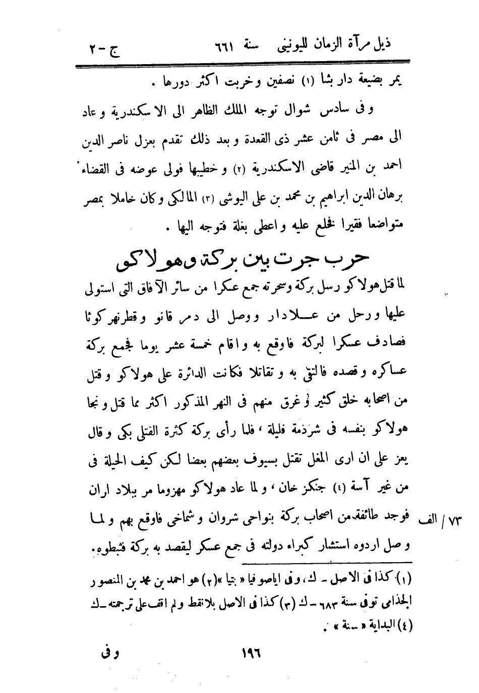 لما قتل هولاكو رسل بركة وسحرته جمع عسكراً من سائر الآفاق التي استولى عليها ورحل من علا دار ووصل إلى دمر قانو وقطر نهر كوثا فصادف عسكراً لبركة فأوقع به وأقام خمسة عشر يوماً فجمع بركة عساكره وقصده فالتقى به وتقاتلا فكانت الدائرة على هولاكو وقتل من أصحابه خلق كثير وغرق منهم في النهر المذكور أكثر مما قتل ونجا هولاكو بنفسه في شرذمة قليلة، فلما رأى بركة كثرة القتلى بكى وقال يعز علي أن أرى المغل تقتل بسيوف بعضهم بعضاً لكن كيف الحيلة في من غير آسة جنكزخان، ولما عاد هولاكو مهزوماً مر ببلاد أران فوجد طائفة من أصحاب بركة بنواحي شروان وشماخي فأوقع بهم ولما وصل أردوه استشار كبراء دولته في جمع عسكر ليقصد به بكرة فثبطوه.