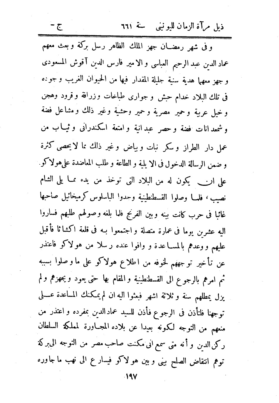 وفي شهر رمضان جهز الملك الظاهر رسل بركة وبعث معهم عماد الدين عبد الرحيم العباسي والأمير فارس الدين آقوش المسعودي وجهز معهما هدية سنية جليلة المقدار فيها من الحيوان الغريب وجوده في تلك البلاد خدام حبش وجواري طباخات وزرافة وقرود وهجن وخيل عربية وحمير مصرية وحمير وحشية وغير ذلك ومشاعل فضة وشمعدانات فضة وحصر عبدانية وأمتعة اسكندراني وثياب من عمل دار الطراز وسكر نبات وبياض وغير ذلك مما لا يحصى كثرة وضمن الرسالة الدخول في الأيلية والطاعة وطلب المعاضدة على هولاكو على أن يكون له من البلاد التي تؤخذ من يده مما يلي الشام نصيب، فلما صولا القسطنطينية وجدوا الباسلوس كرميخائيل صاحبها غائباً في حرب كانت بينه وبين الفرنج فلما بلغه وصولهم طلبهم فساروا إليه عشرين يوماً في عمارة متصلة واجتمعوا به في قلعة أكشاثا فأقبل عليهم ووعدهم بالمساعدة ووافوا عنده رسلاً من هولاكو فاعتذر عن تأخير توجههم لخوفه من إطلاع هولاكو على ما وصلوا بسببه ثم أمرهم بالرجوع إلى القسطنطينية والمقام بها حتى يعود ويجهزهم ولم يزل يمطلهم سنة ثلاثة أشهر فبعثوا إليه أن لم يمكنك المساعدة على توجهنا فلنأذن في الرجوع فأذن للسيد عماد الدين بمفرده واعتذر من منعهم من التوجه لكونه بعيداً عن بلاده المجاورة لمملكة السلطان ركن الدين وأنه متى سمع أني مكنت صاحب مصر من التوجه إلى بركة توهم انتقاض الصلح بيني وبين هولاكو، فيسارع إلى نهب ما جاوره