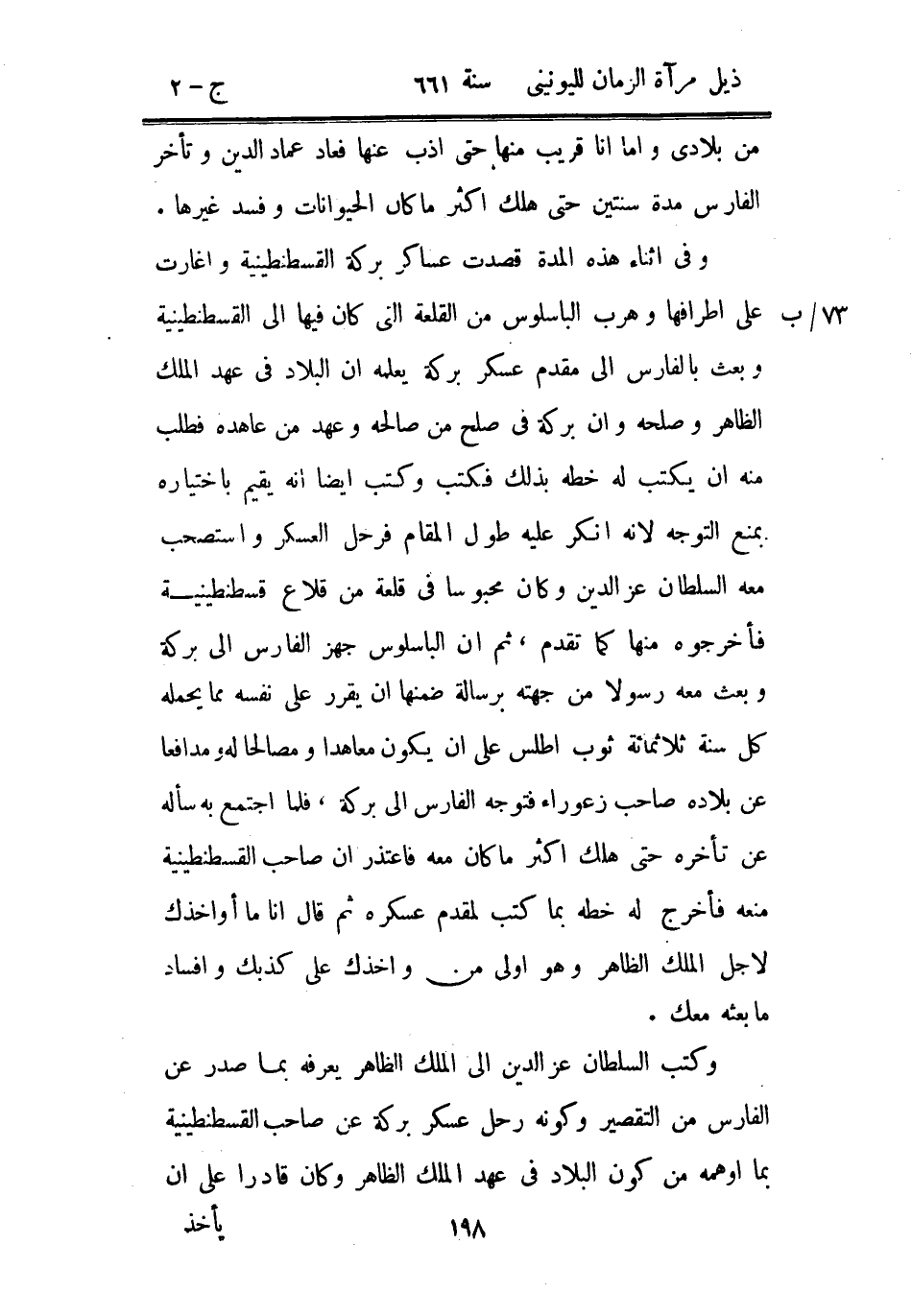 وفي أثناء هذه المدة قصدا عساكر بركة القسطنطينية وأغارت على أطرافها وهرب الباسلوس من القلعة التي كان فيها إلى القسطنطينية وبعث بالفارس إلى مقدم عسكر بركة يعلمه أن البلاد في عهد الملك الظاهر وصلحه وإن بركة في صلح من صالحه وعهد من عاهده فطلب منه أن يكتب له خطة بذلك فكتب وكتب أيضاً أنه يقيم باختياره بمنع التوجه لأنه أنكر عليه طول المقام فرحل العسكر واستصحب معه السلطان عز الدين وكان محبوساً في قلعة من قلاع قسطنطينية فأخرجوه منها كما تقدم، ثم أن الباسلوس جهز الفارسي إلى بركة وبعث معه رسولاً من جهته برسالة ضمنها أن يقرر على نفسه مما يحمله كل سنة ثلاثمائة ثوب أطلس على أن يكون معاهداً ومصالحاً له ومدافعاً عن بلاده صاحب زعوراء فتوجه الفارس إلى بركة، فلما اجتمع به سأله عن تأخره حتى هلك أكثر ما كان معه فاعتذر أن صاحب القسطنطينية منعه فأخرج له خطه بما كتب لمقدم عسكره ثم قال أنا ما أواخذك لأجل الملك الظاهر وهو أولى من وأخذك على كذبك وإفساد ما بعثه معك.