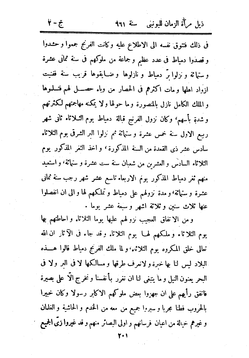 في ذلك فتوق نفسه إلى الإطلاع عليه وكانت الفرنج جمعوا وحشدوا وقصدوا دمياط في عدد عظيم وجماعة من ملوكهم في سنة ثماني عشرة وستمائة ونزلوا بر دمياط ونازلوها وضايقوها قريب سنة ففنيت أزواد أهلها ومات أكثرهم في الحصار من وباء حصل لهم فتسلموها والملك الكامل نازل بالمنصورة وما حولها ولا يمكنه مهاجمتهم لكثرتهم وشدة بأسهم، وكان نزول الفرنج قبالة دمياط يوم الثلاثاء ثاني شهر ربيع الأول سنة خمس عشرة وستمائة ثم نزلوا البر الشرقي يوم الثلاثاء سادس عشر ذي القعدة من السنة المذكورة، وأخذ الثغر المذكور يوم الثلاثاء السادس والعشرين من شعبان سنة ست عشرة وستمائة، واستعيد منهم ثغر دمياط المذكور يوم الأربعاء تاسع عشر شهر رجب سنة ثماني عشرة وستمائة، ومدة نزولهم على دمياط وتملكهم لها وإلى أن انفصلوا عنها ثلاث سنين وثلاثة أشهر وسبعة عشر يوماً.