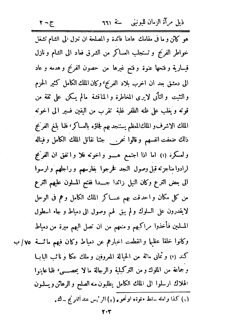 هو كائن وما في مقامك هاهنا فائدة والمصلحة أن تنزل إلى الشام تشغل خواطر الفرنج وتستجلب العساكر من الشرق فعاد إلى الشام ونازل قيسارية وفتحها عنوة وفتح غيرها من حصون الفرنج وهدمه وعاد إلى دمشق بعد أن أخرب بلاد الفرنج، وكان الملك الكامل كثير الحزم والتثبت والتأني لا يرى المخاطرة والمناقشة ما لم يكن على ثقة من قوته ويغلب على ظنه الظفر غلبة تقرب من اليقين فسير إلى إخوته الملك الأشرف والملك المعظم يستنجد بهم فجاؤه بالعساكر، فلما بلغ الفرنج ذلك ضعفت أنفسهم وقالوا نحن جئنا نقاتل الملك الكامل وفينا له ولعسكره أما إذا اجتمع هو وأخوته فلا واتفق أن الفرنج أرادوا مناجزته قبل وصول النجد فخرجوا بفارسهم وراجلهم وأرسوا إلى بعض الترع وكان النيل زائداً جداً ففتح المسلمون عليهم الترع من كل مكان وأحدقت بهم عساكر الملك الكامل وهم في الوحل لا يقدرون على السلوك ولم يبق لهم وصول إلى دمياط وجاء أسطول المسلمين فأخذوا مراكبهم ومنعهم من أن تصل إليهم ميرة من دمياط وكانوا خلقاً عظيماً وانقطعت أخبارهم عن دمياط وكان فيهم مائة كند وثماني مائة من الخيالة المعروفين وملك عكا ونائب البابا وجماعة من الملوك ومن التركبلية والرجالة ما لا يحصى، فلما عاينوا الهلاك أرسلوا إلى الملك الكامل يطلبون منه الصلح والرهائن ويسلمون