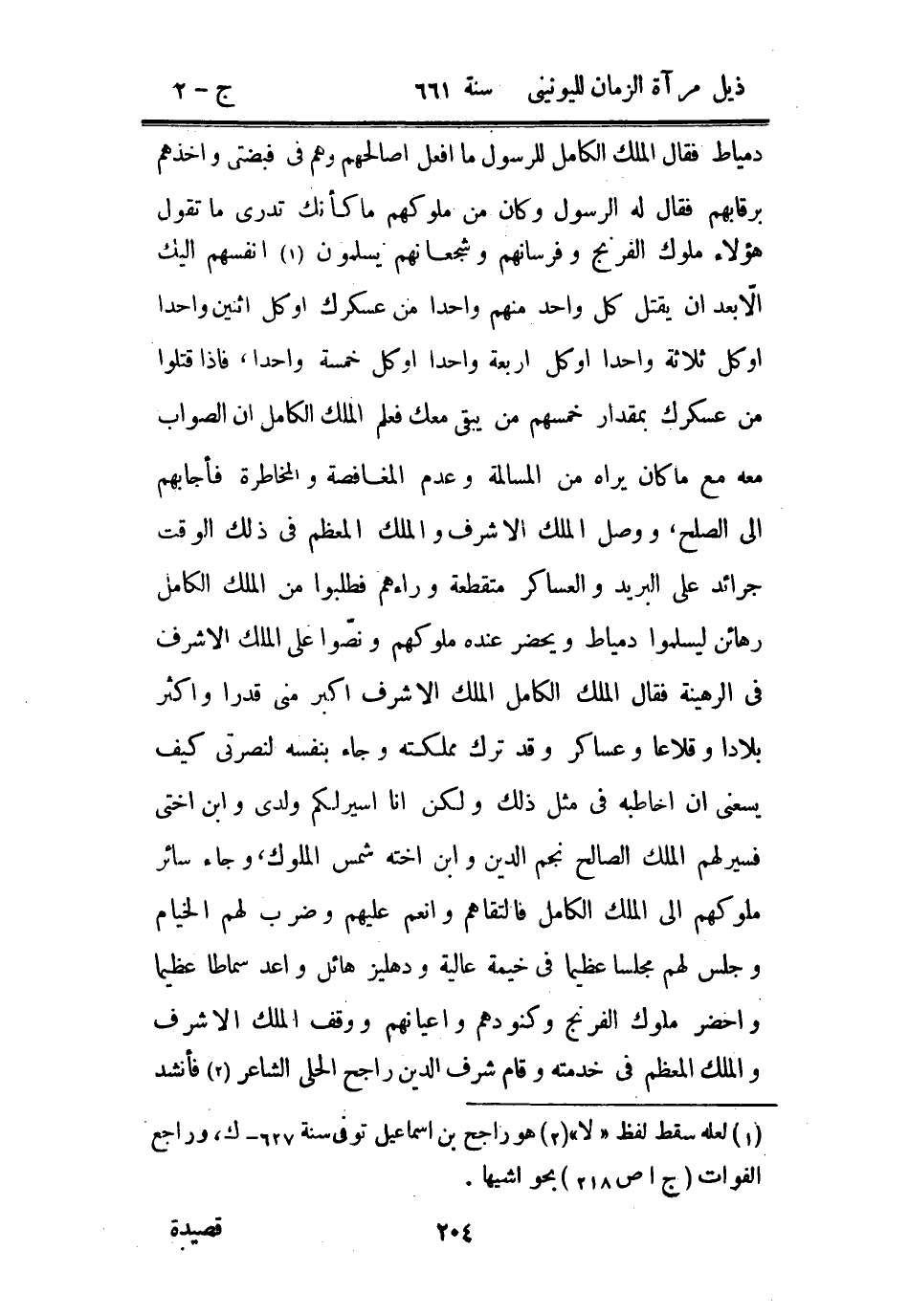 دمياط فقال الملك الكامل للرسول ما أفعل أصالحهم وهم في قبضتي وأخذهم برقابهم فقال له الرسول وكان من ملوكهم ما كأنك تدري ما تقول هؤلاء ملوك الفرنج وفرسانهم وشجعانهم يسلمون أنفسهم إليك إلا بعد أن يقتل كل واحد منهم واحداً من عسكرك أو كل اثنين واحداً أو كل ثلاثة واحداً أو كل أربعة واحداً أو كل خمسة واحداً، فإذا قتلوا من عسكرك بمقدار خمسهم من يبقى معك فعلم الملك الكامل أن الصواب معه مع ما كان يراه من المسالمة وعدم المغافصة والمخاطرة فأجابهم إلى الصلح، ووصل الملك الأشرف والملك الأشرف والملك المعظم في ذلك الوقت جرائد على البريد والعساكر متقطعة وراءهم فطلبوا من الملك الكامل رهائن ليسلموا دمياط ويحضر عنده ملوكهم ونصوا على الملك الأشرف في الرهينة فقال الملك الكامل الملك الأشرف أكبر مني قدراً وأكثر بلاداً وقلاعاً وعساكر وقد ترك مملكته وجاء بنفسه لنصرتي كيف يسعني أن أخاطبه في مثل ذلك ولكن أنا أسير لكم ولدي وابن أختي فسير لهم الملك الصالح نجم الدين وابن أخته شمس الملوك، وجاء سائر ملوكهم إلى الملك الكامل فالتقاهم وأنعم عليهم وضرب لهم الخيام وجلس لهم مجلساً عظيماً في خيمة عالية ودهليز هائل وأعد سماطاً عظيماً وأحضر ملوك الفرنج وكنودهم وأعيانهم ووقف الملك الأشرف والملك المعظم في خدمته وقام شرف الدين راجح الحلى الشاعر فأنشد