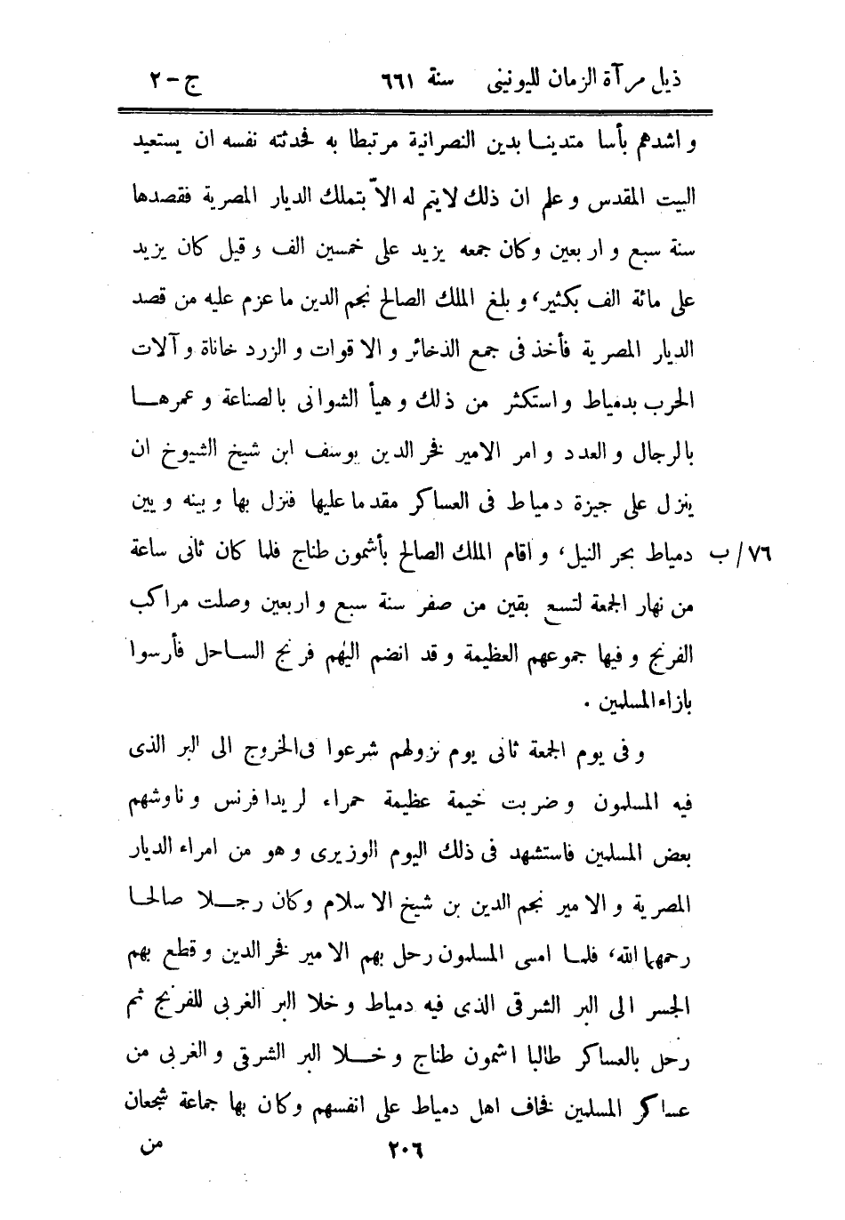 وأشدهم بأساً متديناً بدين النصرانية مرتبطاً به فحدثته نفسه أن يستعيد البيت المقدس وعلم أن ذلك لا يتم له إلا بتملك الديار المصرية فقصدها سنة سبع وأربعين وكان جمعه يزيد على خمسين ألف وقيل كان يزيد على مائة ألف بكثير، وبلغ الملك الصالح نجم الدين ما عزم عليه من قصد الديار المصرية فأخذ في جمع الذخائر والأقوات والزرد خاناة وآلات الحرب بدمياط واستكثر من ذلك وهيأ الشواني بالصناعة وعمرها بالرجال والعدد وأمر الأمير فخر الدين يوسف ابن شيخ الشيوخ أن ينزل على جيزة دمياط في العساكر مقدماً عليها فنزل بها وبينه ويبن دمياط بحر النيل، وأقام الملك الصالح بأشمون طناج فلما كان ثاني ساعة من نهار الجمعة لتسع بقين من صفر سنة سبع وأربعين وصلت مراكب الفرنج وفيها جموعهم العظيمة وقد انضم إليهم فرنج الساحل فأرسلوا بإزاء المسلمين.