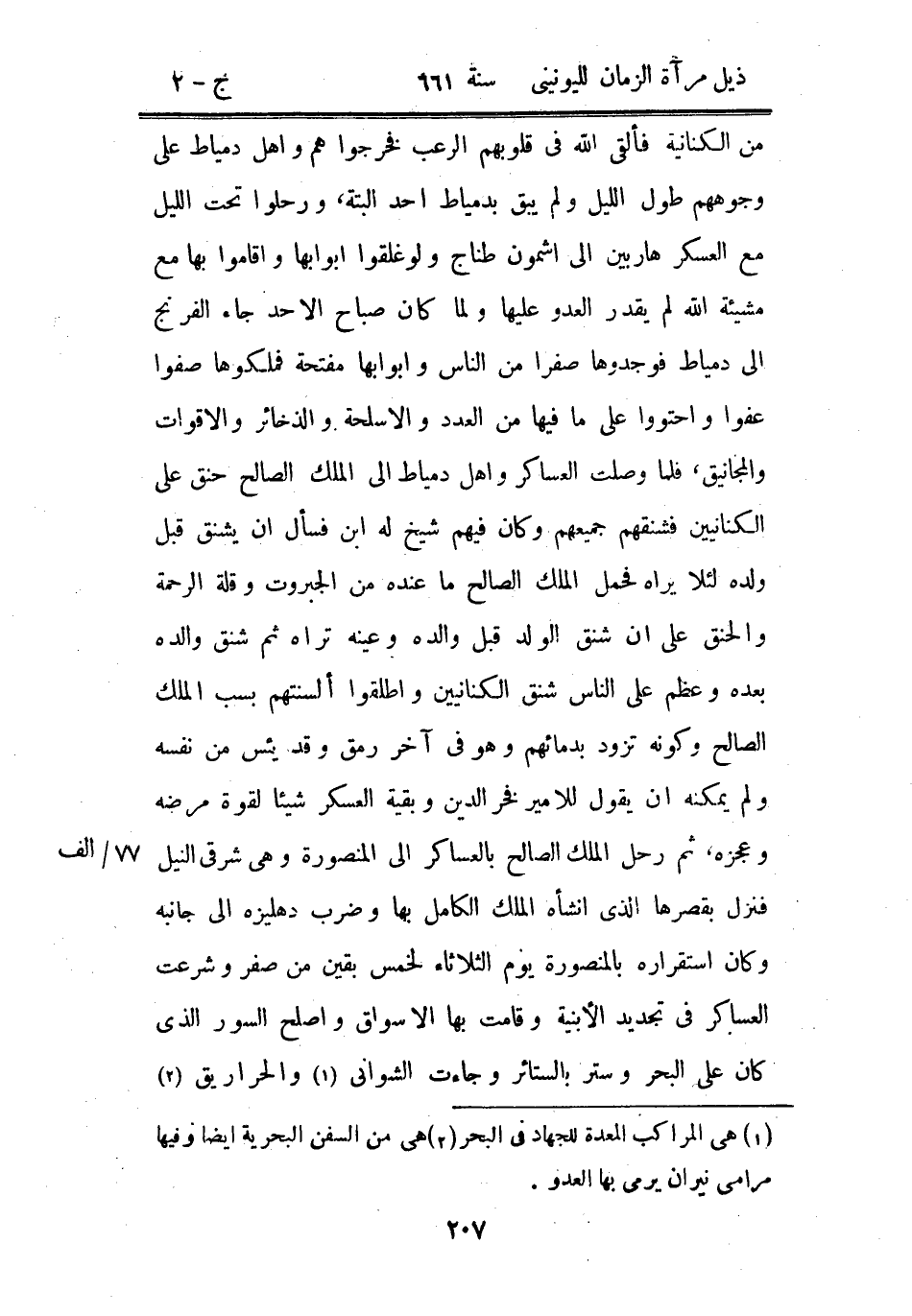 من الكنانية فألقى الله في قلوبهم الرعب فخرجوا هم وأهل دمياط على وجوههم طول الليل ولم يبق بدمياط أحد البتة، ورحلوا تحت الليل مع العسكر هاربين إلى أشمون طناج ولو غلقوا أبوابها وأقاموا بها مع مشيئة الله لم يقدر العدو عليها ولما كان صباح الأحد جاء الفرنج إلى دمياط فوجدوها صفراً من الناس وأبوابها مفتحة فملكوها صفوا عفواً واحتووا على ما فيها من العد والأسلحة والذخائر والأقوات والمجانيق، فلما وصلت العساكر وأهل دمياط إلى الملك الصالح حنق على الكنانيين فشنقهم جميعهم وكان فيهم شيخ له ابن فسأل أن يشنق قبل ولده لئلا يراه فحمل الملك الصالح ما عنده من الجبروت وقلة الرحمة والحنق على أن شنق الولد قبل والده وعينه تراه ثم شنق والده بعده وعظم على الناس شنق الكنانيين وأطلقوا لسنتهم بسبب الملك الصالح وكونه تزود بدمائهم وهو في آخر رمق وقد يئس من نفسه ولم يمكنه أن يقول للأمير فخر الدين وبقية العسكر شيئاً لقوة مرضه وعجزه، ثم رحل الملك الصالح بالعساكر إلى المنصورة وهي شرقي النيل فنزل بقصرها الذي أنشأه الملك الكامل بها وضرب دهليزه إلى جانبه وكان استقراره بالمنصورة يوم الثلاثاء لخمس بقين من صفر وشرعت العساكر في تجديد الأبنية وقامت بها الأسواق وأصلح السور الذي كان على البحر وستر بالستائر وجاءت الشواني والحراريق