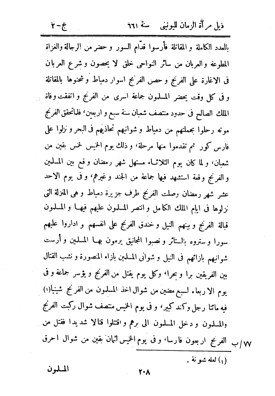 بالعدد الكاملة والمقاتلة فأرسوا قدام السور وحضر من الرجالة والغزاة المطوعة والعربان من سائر النواحي خلق لا يحصون وشرع العربان في الإغارة على الفرنج وحصن الفرنج أسوار دمياط وشحنوها بالمقاتلة وفي كل وقت يحضر المسلمون جماعة سرى من الفرنج واتفقت وفاة الملك الصالح في حدود منتصف شعبان سنة سبع وأربعين، فلما تحقق الفرنج موته رحلوا بجملتهم من دمياط وشوانيهم تحاذيهم في البحر ونزلوا على فارس كور ثم تقدموا منها مرحلة، وذلك يوم الخميس لخمس بقين من شعبان، ولما كان يوم الثلاثاء مستهل شهر رمضان وقع بين المسلمين والفرنج وقعة استشهد فيها جماعة من الجند وغيرهم، وفي يوم الأحد عشر شهر رمضان وصلت الفرنج طرف جزيرة دمياط وهي المنزلة التي نزلوها في أيام الملك الكامل وانتصر المسلمون عليهم فيها والمسلمون قبالة الفرنج وبينهم النيل وخندق الفرنج على أنفسهم وأداروا عليهم سوراً وستروه بالستائر ونصبوا المجانيق يرمون بها المسلمين وأرست شوانيهم بإزائهم في النيل وشواني المسلمين بإزاء المنصورة ونشب القتال بين الفريقين براً وبحراً، وكل يوم يقتل من الفرنج ويؤسر جماعة وفي يوم الأربعاء لسبع مضين من شوال أخذ المسلمون من الفرنج شينيا فيه مائتا رجل وكند كبير، وفي يوم الخميس منتصف شوال ركبت الفرنج والمسلمون ودخل المسلمون إلى برهم واقتتلوا قتالاً شديداً فقتل من الفرنج أربعون فأرسا، وفي يوم الخميس لثمان بقين من شوال أحرق