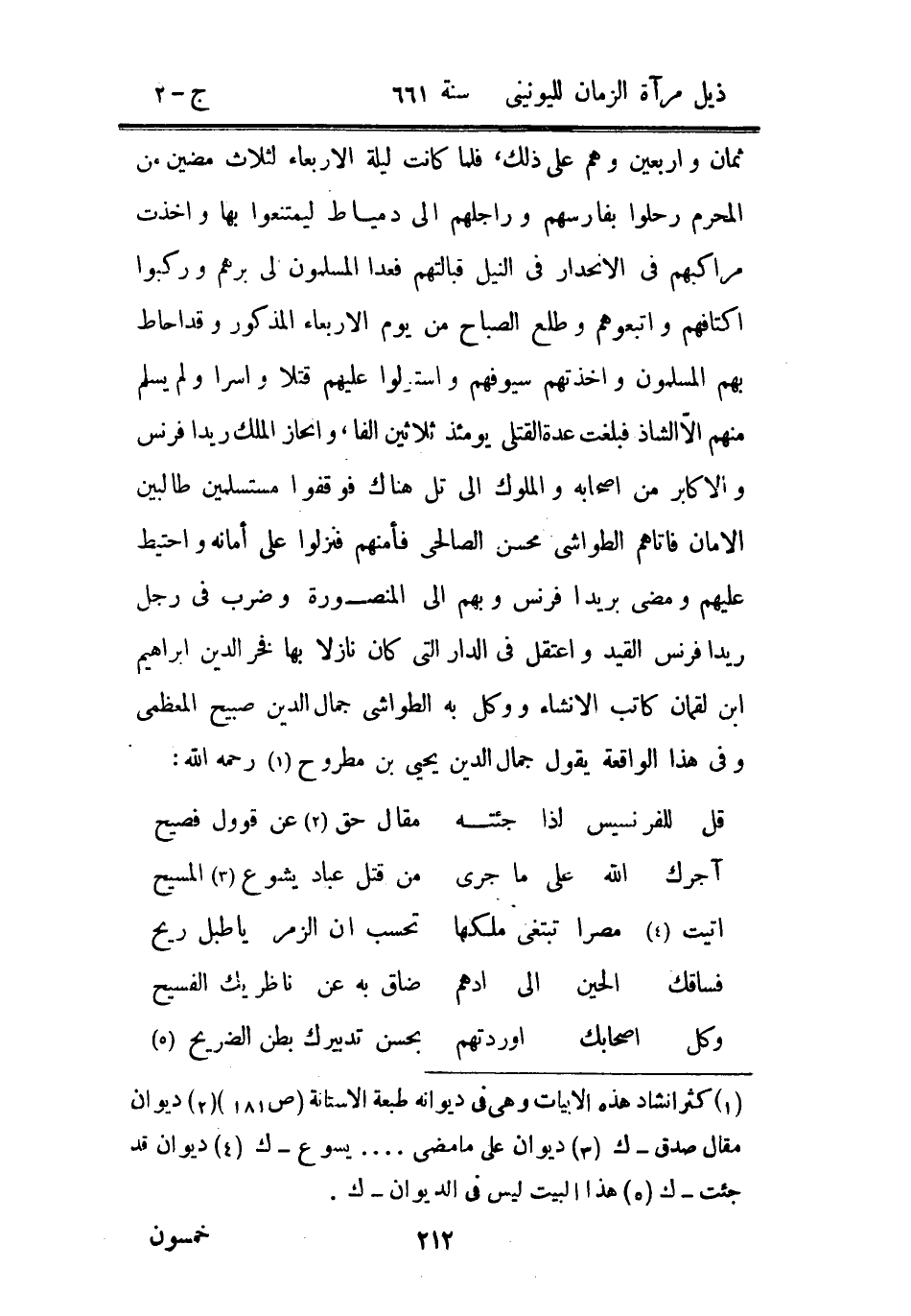 ثمان وأربعين وهم على ذلك، فلما كانت ليلة الأربعاء لثلاث مضين من المحرم رحلوا بفارسهم وراجلهم إلى دمياط ليمتنعوا بها وأخذت مراكبهم في الانحدار في النيل قبالتهم فعدا المسلمون لي برهم وركبوا أكتافهم واتبعوهم وطلع الصباح من يوم الأربعاء المذكور وقد أحاط بهم المسلمون وأخذتهم سيوفهم واستنزلوا عليهم قتلاً وأسراً ولم يسلم منهم إلا الشاذ فبلغت عدة القتلى يومئذ ثلاثين ألفاً، وانحاز الملك ريدا فرنس والأكابر من أصحابه والملوك إلى تل هناك فوقفوا مستسلمين طالبين الأمان فأتاهم الطواشي محسن الصالحي فأمنهم فنزلوا على أمانه واحتيط عليهم ومضى بريداً فرنس وبهم إلى المنصورة وضرب في رجل ريدا فرنس القيد واعتقل في الدار التي كان نازلاً بها فخر الدين إبراهيم ابن لقمان كاتب الإنشاء ووكل به الطواشي جمال الدين صبيح المعظمي وفي هذا الواقعة يقول جمال الدين يحيى بن مطروح رحمه الله: