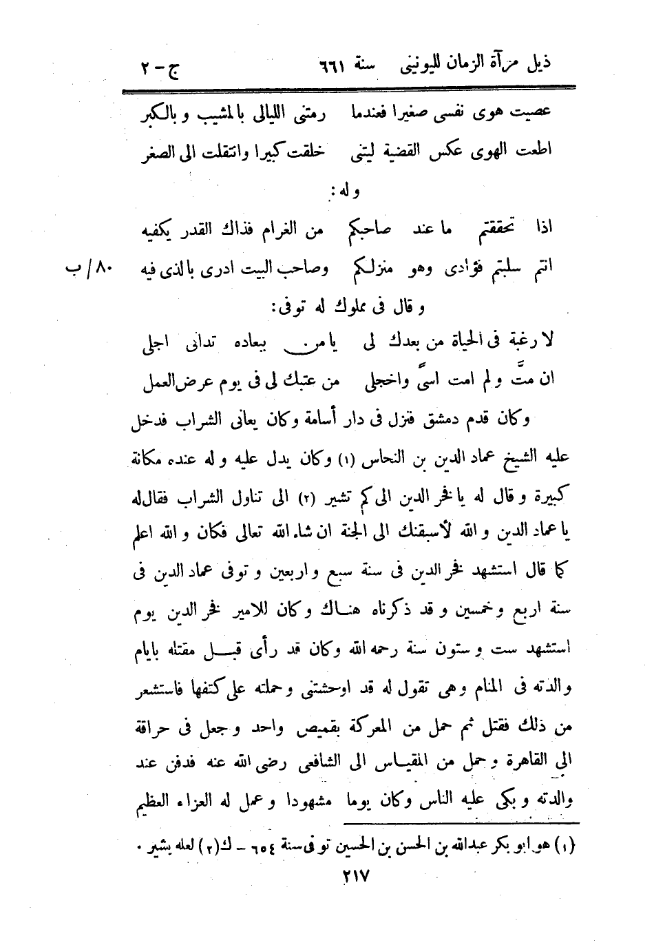 وكان قدم دمشق فنزل في دار أسامة وكان يعاني الشراب فدخل عليه الشيخ عماد الدين بن النحاس وكان يدل عليه وله عنده مكانة كبيرة وقال له يا فخر الدين إلى كم تشير إلى تناول الشراب فقال له يا عماد الدين والله لأسبقنك إلى الجنة إن شاء الله تعالى فكان والله أعلم كما قال استشهد فخر الدين في سنة سبع وأربعين وتوفي عماد الدين في سنة أربع وخمسين وقد ذكرناه هناك وكان للأمير فخر الدين يوم استشهد ست وستون سنة رحمه الله وكان قد رأى قبل مقتله بأيام والدته في المنام وهي تقول له قد أوحشتني وحملته على كتفها فاستشعر من ذلك فقتل ثم حمل من المعركة بقميص واحد وجعل في حراقة إلى القاهرة وحمل من المقياس إلى الشافعي رضي الله عنه فدفن عند والدته وبكى عليه الناس وكان يوماً مشهوداً وعمل له العزاء العظيم