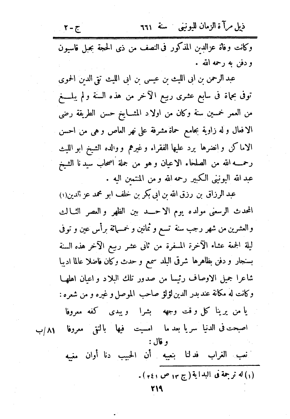 عبد الرزاق بن رزق الله بن أبي بكر بن خلف أبو محمد عز الدين المحدث الرسعني مولده يوم الأحد بين الظهر والعصر الثالث والعشرين من شهر رجب سنة تسع وثمانين وخمسمائة برأس عين وتوفي ليلة الجمعة عشاء الآخرة المسفرة من ثاني عشر ربيع الآخر هذه السنة بسنجار ودفن بظاهرها شرقي البلد سمع وحدث وكان فاضلاً عالماً أديباً شاعراً جميل الأوصاف رئيساً من صدور تلك البلاد وأعيان أهلها وكانت له مكانة عند بدر الدين لؤلؤ صاحب الموصل وغيره ومن شعره: