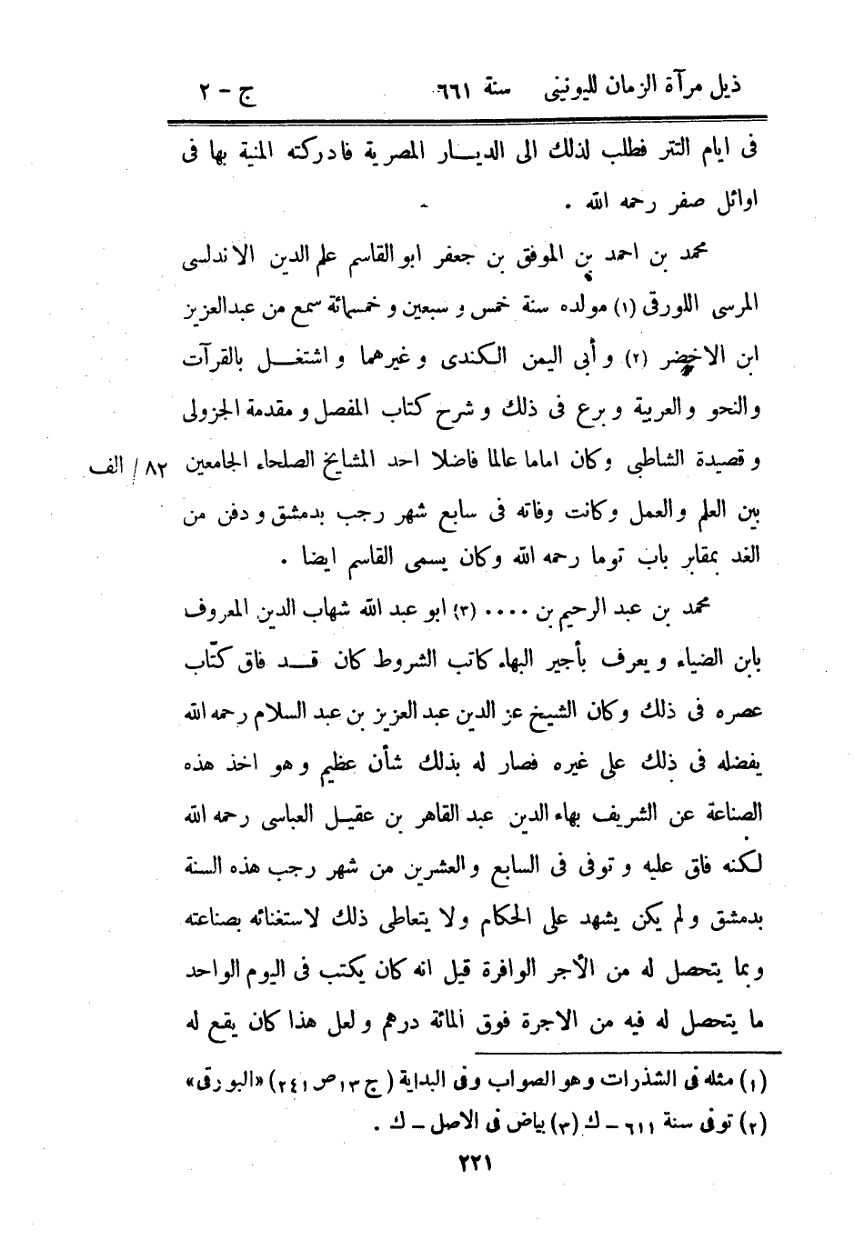 محمد بن عبد الرحيم بن.... أبو عبد الله شهاب الدين المعروف بابن الضياء ويعرف بأجير البهاء كاتب الشروط كان قد فاق كتاب عصره في ذلك وكان الشيخ عز الدين عبد العزيز بن عبد السلام رحمه الله يفضله في ذلك على غيره فصار له بذلك شأن عظيم وهو أخذ هذه الصناعة عن الشريف بهاء الدين عبد القاهر بن عقيل العباسي رحمه الله لكنه فاق عليه وتوفي في السابع والعشرين من شهر رجب هذه السنة بدمشق ولم يكن يشهد على الحكام ولا يتعاطى ذلك لاستغنائه بصناعته وبما يتحصل له من الأجر الوافرة قيل أنه كان يكتب في اليوم الواحد ما يتحصل له فيه من الأجرة فوق المائة درهم ولعل هذا كان يقع له