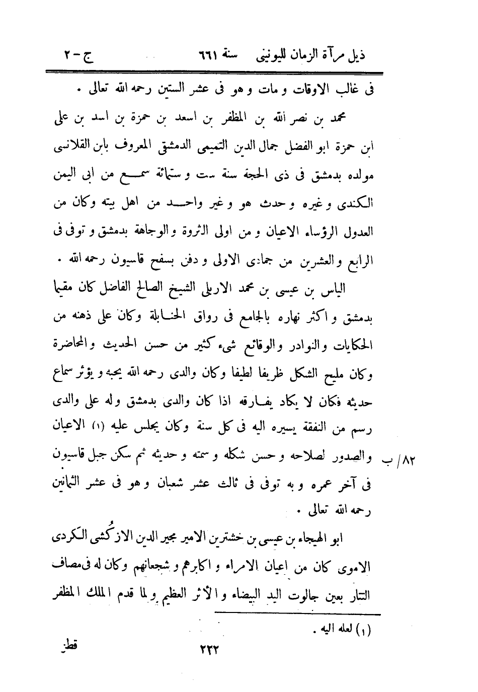 محمد بن نصر الله بن المظفر بن أسعد بن حمزة بن أسد بن علي ابن حمزة أبو الفضل جمال الدين التميمي الدمشقي المعروف بابن القلانسي مولده بدمشق في ذي الحجة سنة ست وستمائة سمع من أبي اليمن الكندي وغيره وحدث هو وغير واحد من أهل بيته وكان من العدول الرؤساء الأعيان ومن أولي الثروة والوجاهة بدمشق وتوفي في الرابع والعشرين من جمادى الأولى ودفن بسفح قاسيون رحمه الله.