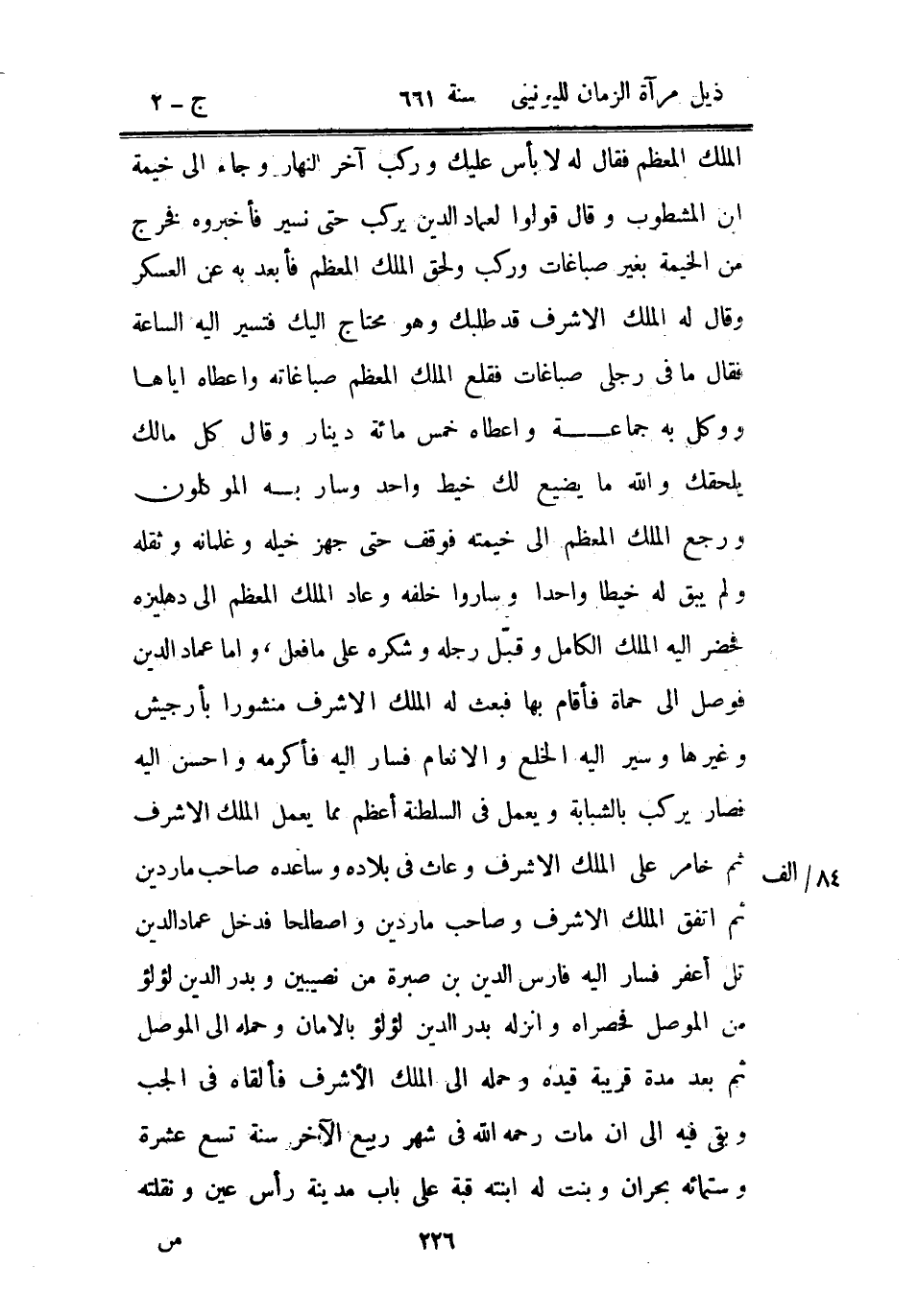 الملك المعظم فقال له لا بأس عليك وركب آخر النهار وجاء إلى خيمة ابن المشطوب وقال قولوا لعماد الدين يركب حتى نسير فأخبروه فخرج من الخيمة بغير صباغات وركب ولحق الملك المعظم فأبعد به عن العسكر وقال له الملك الأشرف قد طلبك وهو محتاج إليك فتسير إليه الساعة فقال ما في رجلي صباغات فقلع الملك المعظم صباغاته وأعطاه إياها ووكل به جماعة وأعطاه خمس مائة دينار وقال كل مالك يلحقك والله ما يضيع لك خيط واحد وسار به الموكلون ورجع الملك المعظم إلى خيمته فوقف حتى جهز خيله وغلمانه وثقله ولم يبق له خيطاً واحداً وساروا خلفه وعاد الملك المعظم إلى دهليزه فحضر إليه الملك الكامل وقبل رجله وشكره على ما فعل، وأما عماد الدين فوصل إلى حماة فأقام بها فبعث له الملك الأشرف منشوراً بأرجيش وغيرها وسير إليه الخلع والإنعام فسار إليه فأكرمه وأحسن إليه فصار يركب بالشبابة ويعمل في السلطنة أعظم مما يعمل الملك الأشرف ثم خامر على الملك الأشرف وعاث في بلاده وساعده صاحب ماردين ثم اتفق الملك الشرف وصاحب ماردين واصطلحا فدخل عماد الدين تل أعفر فسار إليه فارس الدين بن صبرة من نصيبين وبد الدين لؤلؤ من الموصل فحصراه وأنزله بدر الدين لؤلؤ بالأمان وحمله إلى الموصل ثم بعد مدة قريبة قيده وحمله إلى الملك الأشرف فألقاه في الجب وبقي فيه إلى أن مات رحمه الله في شهر ربيع الآخر سنة تسع عشرة وستمائة بحران ونبت له ابنته قبة على باب مدينة رأس عين ونقلته