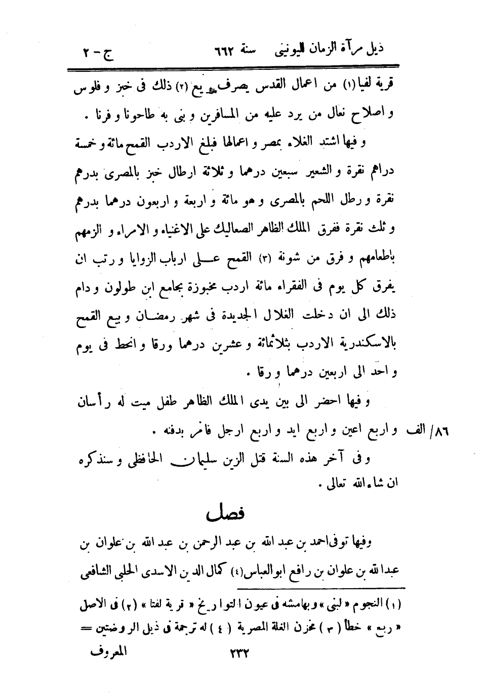 وفيها أحضر إلى بين يدي الملك الظاهر طفل ميت له رأسان وأربع أعين وأربع أيد وأربع أرجل فأمر بدفنه.