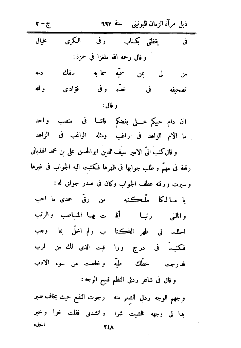 وقال كتب إلى الأمير سيف الدين أبو الحسن علي بن محمد الهذباني رقعة في مهم وطلب جوابها في ظهرها فكتبت إليه الجواب في غيرها وسيرت ورقته عطف الجواب وكان في صدر جوابي له:
