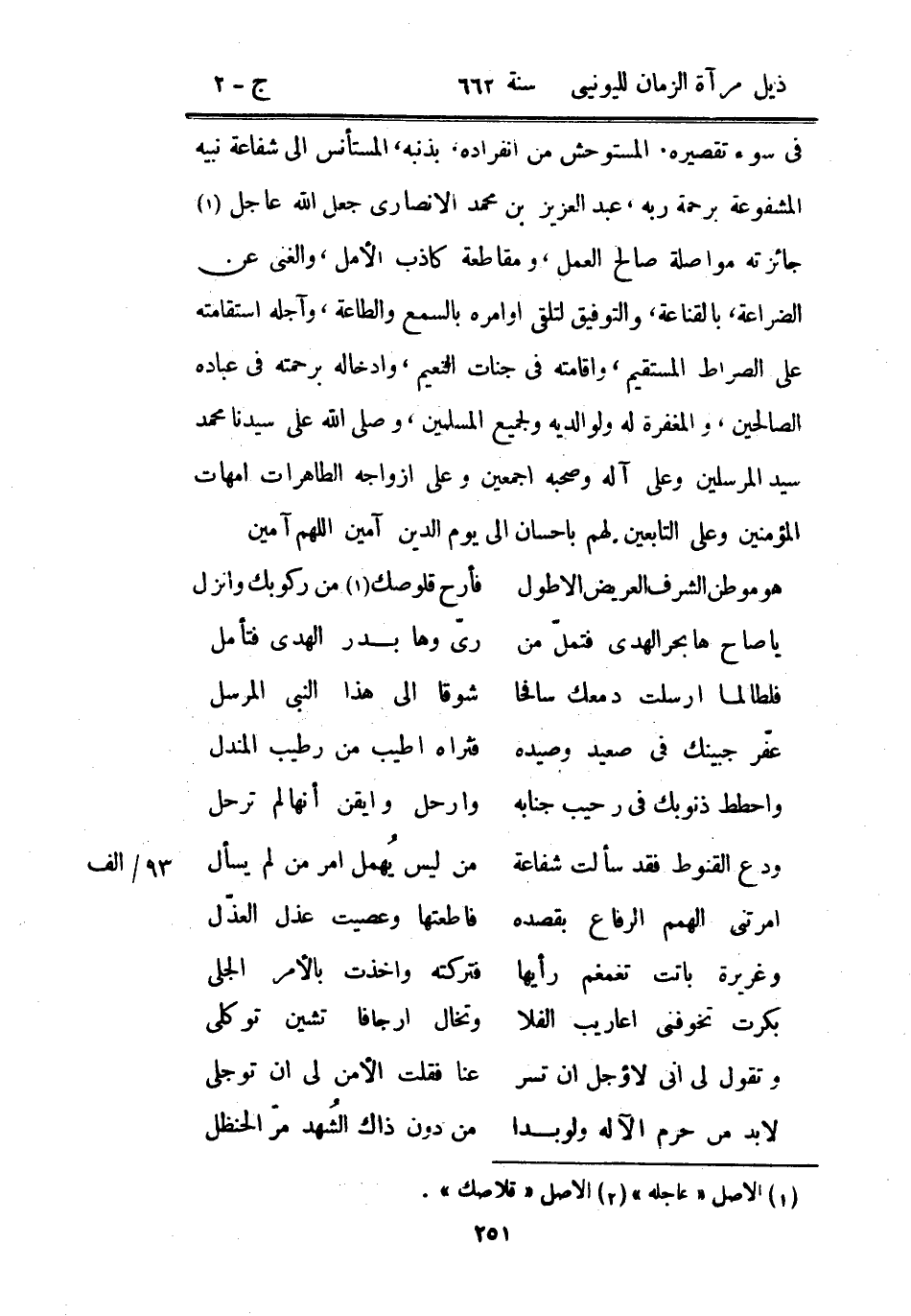 في سوء تقصيه. المستوحش من انفراده، بذنبه، المستأنس إلى شفاعة نبيه المشفوعة برحمة ربه، عبد العزيز بن محمد الأنصاري جعل الله عاجل جائزته مواصلة صالح العمل، ومقاطعة كاذب الأمل، والغني عن الضارعة بالقناعة، والتوفيق لتلقي أوامره بالسمع والطاعة، وآجله استقامته على الصراط المستقيم، وأقامته في جنات النعيم، وإدخاله برحمته في عباده الصالحين، والمغفرة له ولوالديه ولجميع المسلمين، وصلى الله على سيدنا محمد سيد المرسلين وعلى آله وصحبه أجمعين وعلى أزواجه الطاهرات أمهات المؤمنين وعلى التابعين. لهم بإحسان إلى يوم الدين آمنين اللهم آمين.