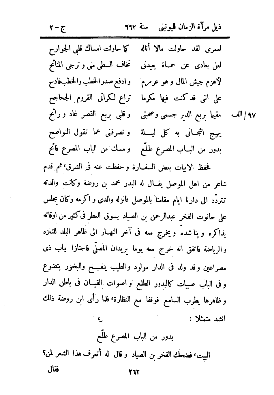 ؟ بدور من الباب المصرع طلع ومسك من الباب المصرع فائح فحفظ الأبيات بعض السفارة وحفظت عنه في الشرق، ثم قدم شاعر من أهل الموصل يقال له البدر محمد بن روضة وكانت والدته تتردد إلى دارنا أيام مقامنا بالموصل فأنزله والدي وأكرمه وكن يجلس على حانوت الفخر عبد الرحمن بن الصياد بسوق العطر في كثير من أوقاته يذاكره ويناشده ويخرج معه في آخر النهار إلى ظاهر البلد للتنزه والرياضة فاتفق أنه خرج معه يوماً يريدان المصلى فاجتازا بباب ذي مصراعين وقد ولد في الدار مولود والطيب ينفح والبخور يتضوع وفي الباب صبيات كالبدور الطلع وأصوات القيان في باطن الدار وظاهرها يطرب السامع فوقفا مع النظارة، فلما رأى ابن روضة ذلك أنشد متمثلاً:؟ بدور من الباب المصرع طلع البيت، فضحك الفخر بن الصياد وقال له أتعرف هذا الشعر لمن؟