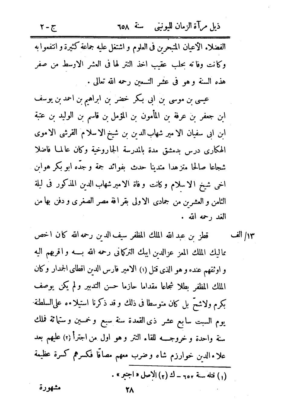 قطز بن مالك بن عبد الله المظفر سيف الدين رحمه الله كان أخص مماليك الملك المعز عز الدين أيبك التركماني رحمه الله به وأقربهم إليه وأوثقهم عنده وهو الذي قتل الأمير فارس الدين أقطاي الجمدار وكان الملك المظفر بطلاً شجاعاً مقداماً حازماً حسن التدبير ولم يكن يوصف بكرم ولا شح بل كان متوسطاً في ذلك وقد ذكرنا استيلاءه على السلطنة سنة واحدة وخروجه للقاء التتر وهو أول من اجترأ عليهم بعد علاء الدين خوارزم شاه وضرب معهم مصافاً فكسرهم كسرة عظيمة