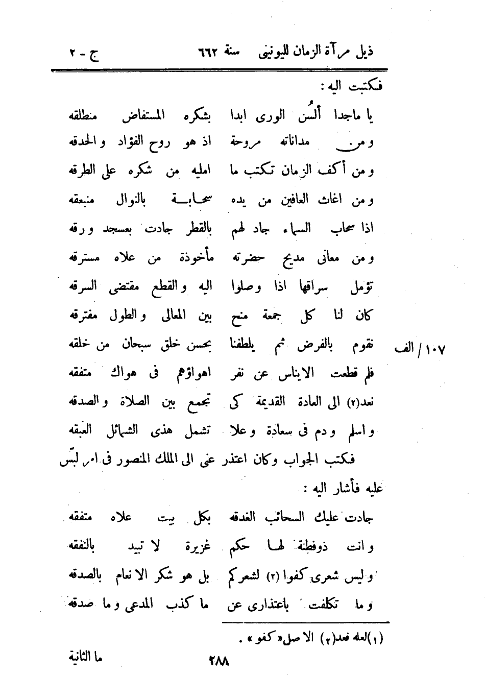 فكتب الجواب وكان اعتذر عني إلى الملك المنصور في أمر لبس عليه فأشار إليه: