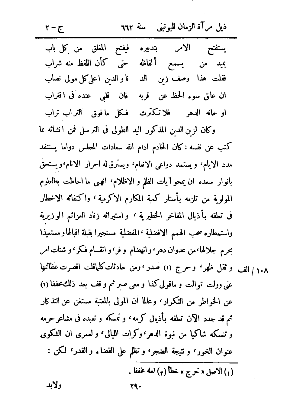 وكان لزين الدين المذكور اليد الطولي في الترسل فمن أنشأته مما كتب عن نفسه: كان الخادم أدام الله سعادات المجلس دواماً يستنفد مدد الأيام، ويستمد دواعي الأنعام، ويسترق له أحرار الأنام، ويستحق بأنوار سعده أ، يمحو آيات الظلم والإظلام، وأنهى ما أحاطت به العلوم المولوية من تلزمه بأستار كعبة المكارم الأكرمية، واكتفائه الأخطار في تعلقه بأذيال المفاخر الخطيرية، واستيرائه زناد العزائم الوزيرية واستمطاره سحب الهمم الأفضلية، المفضلية مستجيراً بقبلة إقبالها ومستعيذاً بحرم جلالها، من عدوان دهر، وانهضام وفر، وانقسام فكرن وشتات أمر وثقل ظهر، وحرج صدر، ومن حادثات كلما قلت أقصرت عظائمها عني وولت توالت وما قولي كذا ومعي صبر ثم وقف بعد ذلك محففاً عن الخواطر من التكرار، وعالماً أن المولى بالمعتبة مستغن عن التذكار