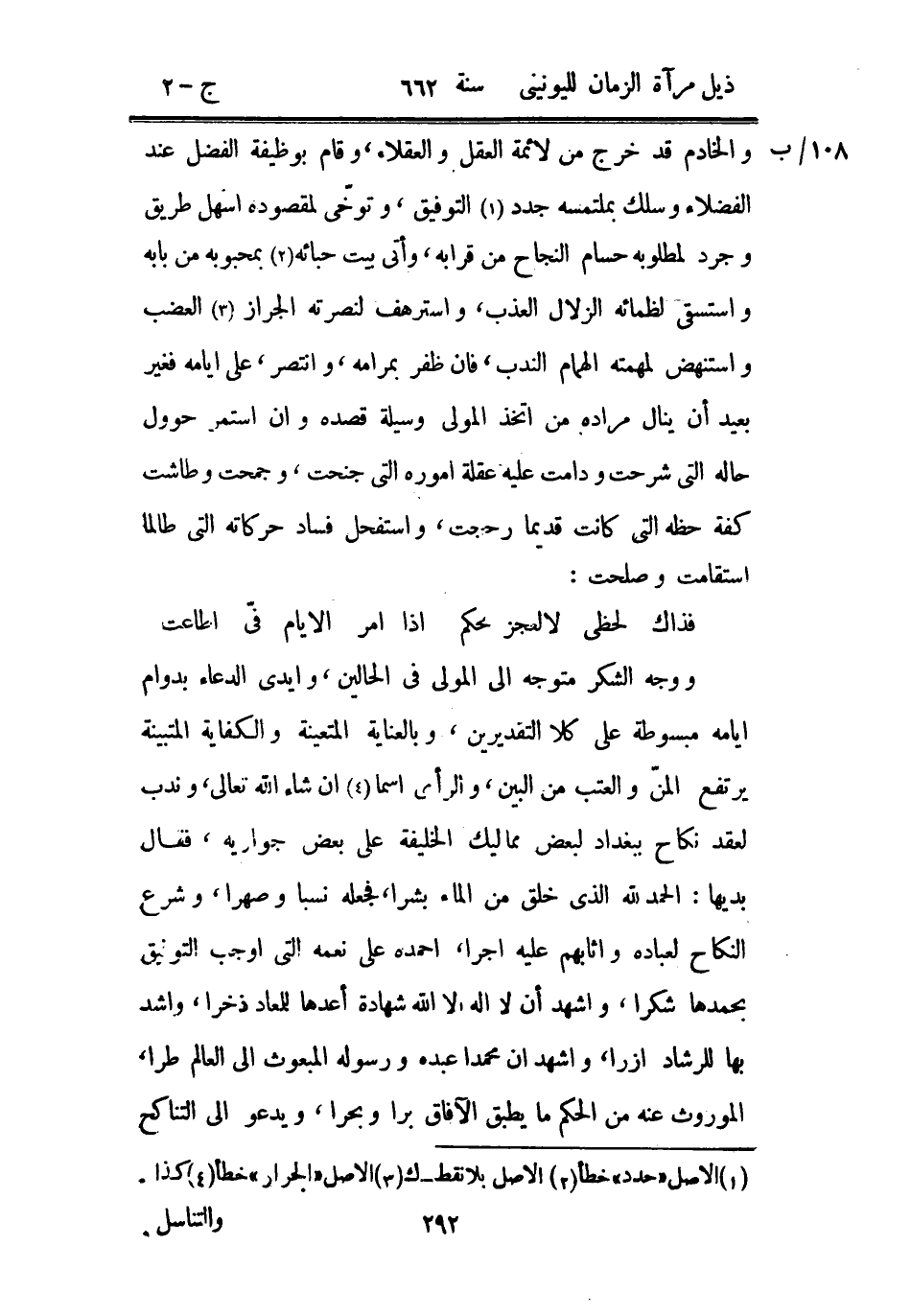والخادم قد خرج من لائمة العقل والعقلاء، وقام بوظيفة الفضل عند الفضلاء وسلك بملتمسه جد التوفيق، وتوخى لمقصوده أسهل طريق وجرد لمطلوبه حسام النجاح من قرابه، وأتى بيت حبائه بمحبوبه من بابه واستسقى لظمائه الزلال العذب، واسترهف لنصرته الجراز العضب واستنهض لمهمته الهمام الندب، فإن ظفر بمرامه، وانتصرن على أيامه فغير بعيد أن ينال مراده من اتخذ المولى وسيلة قصده وإن استمر حول حاله التي شرحت ودامت عليه عقلة أموره التي جنحت، وجمحت وطاشت كفة حظه التي كانت قديماً رجعت، واستفحل فساد حركاته التي طالما استقامت وصلحت: