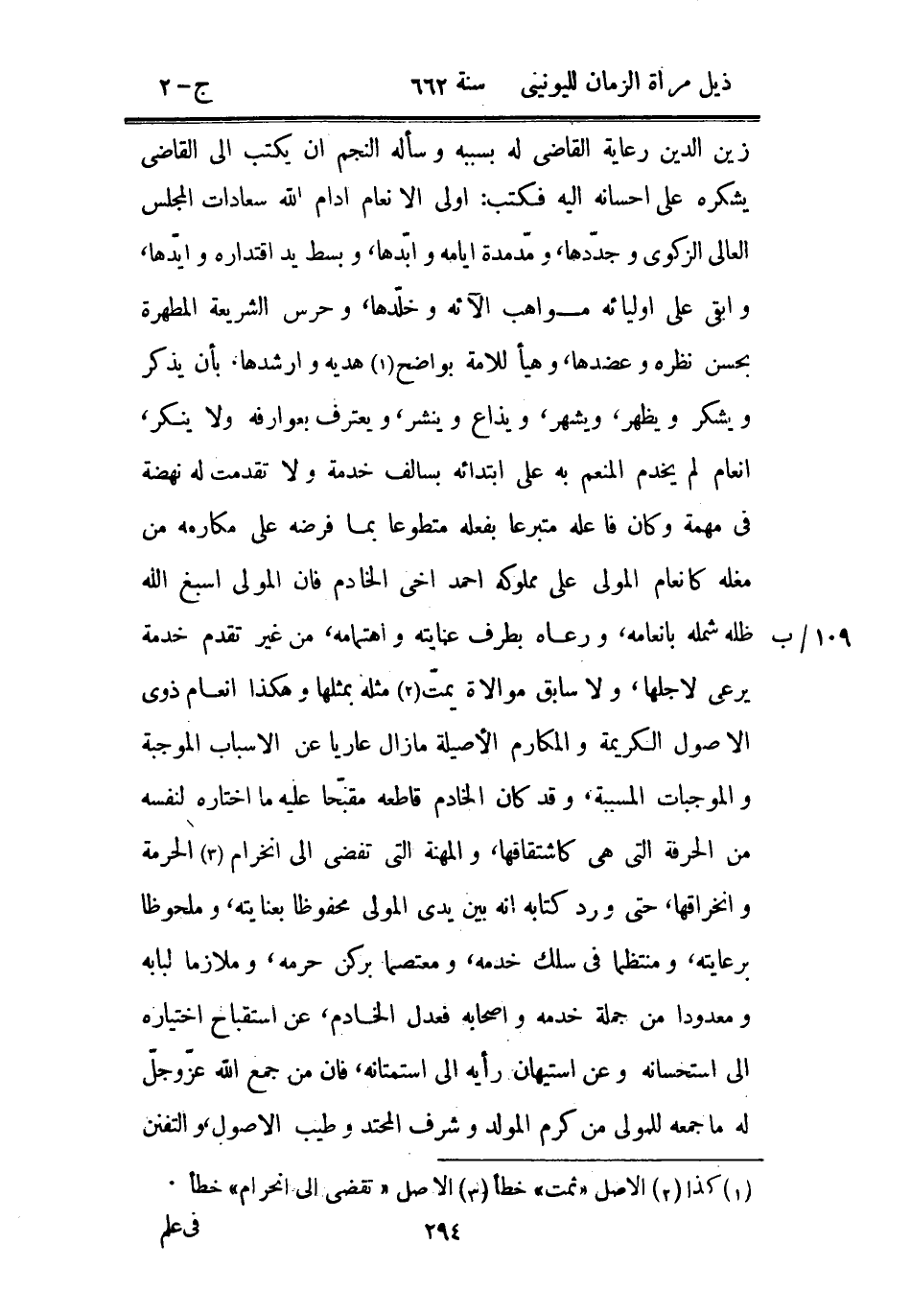 زين الدين رعاية القاضي له بسببه وسأله النجم أن يكتب إلى القاضي يشكره على إحسانه إليه فكتب: أولي الأنعام أدام الله سعادات المجلس العالي الزكوي وجددها، ومدمدة أيامه وأبدها، وبسط يد اقتداره وأيدها، وأبقى على أوليائه مواهب الآئه وخلدها، وحرس الشريعة المطهرة بحسن نظره وعضدها، وهيأ للأمة بواضح هديه وأرشدها، بأن يذكر ويشكر ويظهر، ويشهر، ويذاع وينشر، ويعترف بعوارفه ولا ينكر، أنعام لم يخدم المنعم به على ابتدائه بسالف خدمة ولا تقدمت له نهضة في مهمة وككان فاعله متبرعاً بفعله متطوعاً بما فرضه على مكارمه من مغله كأنعام المولى على مملوكه أحمد أخي الخادم فإن المولى أسبغ الله ظله شمله بأنعامه، ورعاه بطرف عنايته واهتمامه، من غير تقدم خدمة يرعى لأجلها، ولا سابق موالاة يمت مثله بمثلها وهكذا أنعام ذوي الأصول الكريمة والمكارم الأصيلة ما زال عارياً عن الأسباب الموجبة والموجبات المسببة، وقد كان الخادم قاطعه مقبحاً عليه ما اختاره لنفسه من الحرفة التي هي كاشتقاقها، والمهنة التي تفضي إلى انخرام الحرمة وانخراقها، حتى ورد كتابه أنه بين يدي المولى محفوظاً بعنايته، وملحوظاً برعايته، ومنتظماً في سلك خدمه، ومعتصماً بركن حرمه، وملازماً لبابه ومعدوداً من جملة خدمه وأصحابه فعدل الخادم، عن استقباح اختياره إلى استحسانه وعن استيهان رأيه إلى استمتانه، فإن من جمع الله عز وجل له ما جمعه للمولى من كرم المولد وشرف المحتد وطيب الأصول والتفنن