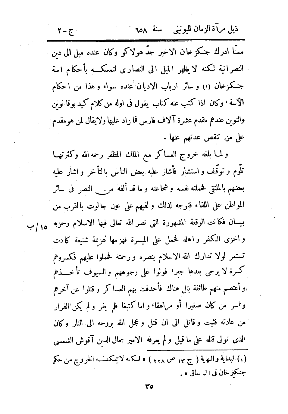ولما بلغه خروج العساكر مع الملك المظفر رحمه الله وكثرتها تلوم وتوقف واستشار فأشار عليه بعض الناس بالتأخر وأشار عليه بعضهم بالملتقى فحملته نفسه وشجاعته وما قد ألفه من النصر في سائر المواطن على اللقاء فتوجه لذلك ولقيهم على عين جالوت بالقرب من بيسان فكانت الوقعة المشهورة التي نصر الله تعالى فيها الإسلام وحزبه وأخزى الكفر وأهله فحمل على الميسرة فهزمها هزيمة شنيعة كادت تستمر لولا تدارك الله الإسلام بنصره ورحمته فحملوا عليهم فكسروهم كسرة لا يجرى بعدها جبر، فولوا على وجوههم والسيوف تأخذهم وأعتصم منهم طائفة بتل هناك فأحدقت بهم العساكر وقتلوا عن آخرهم وأسر من كان صغيراً أو مراهقاً، وأما كتبغا فلم يفر ولم يكن الفرار من عادته فثبت وقاتل إلى أن قتل وعجل الله بروحه إلى النار وكان الذي تولى قتله على ما قيل ولم يعرفه الأمير جمال الدين آقوش الشمس