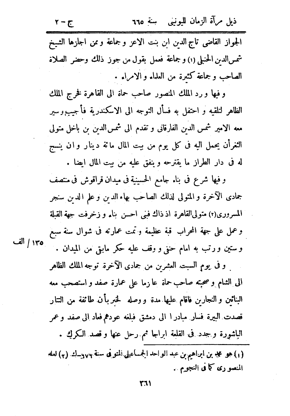 وفيها شرع في بناء جامع الحسينية في ميدان قراقوش في منتصف جمادى الآخرة والمتولي لذلك الصاحب بهاء الدين وعلم الدين سنجر المسروري متولي القاهرة إذ ذاك فبنى أحسن بناء وزخرفت جهة القبلة وعمل على جهة المحراب قبة عظيمة وتمت عمارته في شوال سنة سبع وستين ورتب به إمام حنفي ووقف عليه حكر ما بقي من الميدان.