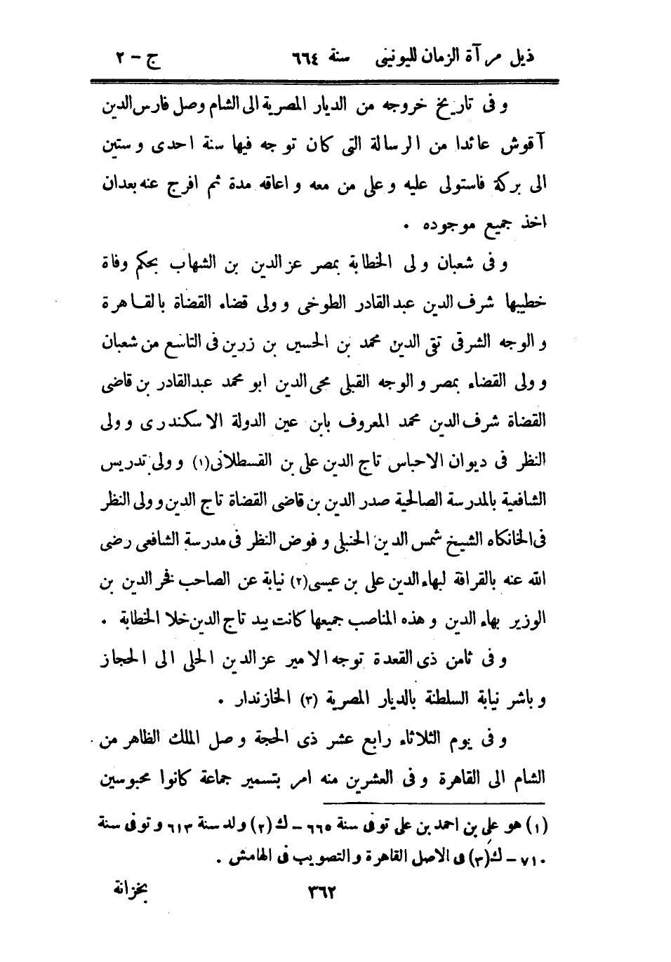 وفي شعبان ولي الخطابة بمصر عز الدين بن الشهاب بحكم وفاة خطيبها شرف الدين عبد القادر الطوخي وولي قضاء القضاة بالقاهرة والوجه الشرقي تقي الدين محمد بن الحسين بن زرين في التاسع من شعبان وولي القضاء بمصر والوجه القبلي محي الدين أبو محمد عبد القادر بن قاضي القضاة شرف الدين محمد المعروف بابن عين الدولة الإسكندري وولي النظر في ديوان الأحباس تاج الدين علي بن القسطلاني وولى تدريس الشافعية بالمدرسة الصالحية صدر الدين بن قاضي القضاة تاج الدين وولى النظر في الخانكاه الشيخ شمس الدين الحنبلي وفوض النظر في مدرسة الشافعي رضي الله عنه بالقرافة لبهاء الدين علي بن عيسى نيابة عن الصاحب فخر الدين بن الوزير بهاء الدين وهذه المناصب جميعها كانت بيد تاج الدين خلا الخطابة وفي ثامن ذي القعدة توجه الأمير عزالدين الحلي إلى الحجاز وباشر نيابة السلطنة بالديار المصرية الخازندار.