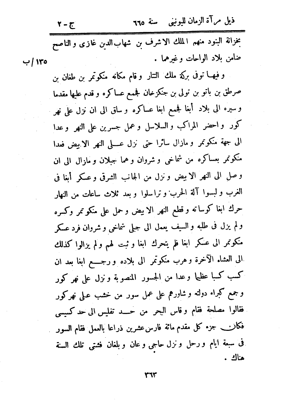 وفيها توفي بركة ملك التتار وقام مكانه منكوتمر بن طغان بن صرطق بن باتو بن تولي بن جنكز خان فجمع عساكره وقدم عليها مقدماً وسيره إلى بلاد أبغا فجمع أبغا عساكره وساق إلى أن نزل على نهر كور وأحضر المراكب والسلاسل وعمل جسرين على النهر وعدا إلى جهة منكوتمر وما زال سائراً حتى نزل على النهر الأبيض فعدا منكوتمر بعساكره من شماخي وشروان وهما جبلان وما زال إلى أن وصل إلى النهر الأبيض ونزل من الجانب الشرقي وعسكر أبغا في الغرب ولبسوا آلة الحرب وتراسلوا وبعد ثلاث ساعات من النهار حرك أبغا كوساته وقطع النهر الأبيض وحمل على منكوتمر وكسره ولم يزل في طلبه والسيف يعمل إلى جبلي شماخي وشروان فرد عسكر منكوتمر إلى عسكر أبغا فلم يتحرك أبغا وثبت لهم ولم يزالوا كذلك إلى العشاء الآخرة وهرب منكوتمر إلى بلاده ورجع أبغا بعد أن كسب كسباً عظيماً وعدا من الجسور المنصوبة ونزل على نهر كور وجمع كبراء دولته وشاورهم على عمل سور من خشب على نهر كور فقالوا مصلحة فقام وقاس البحر من حد تفليس إلى حد كسيس فكان جزء كل مقدم مائة فارس عشرين ذراعاً بالعمل فقام السور في سبعة أيام ورحل ونزل حاجى وعان وبلغان فشتى تلك السنة هناك.
