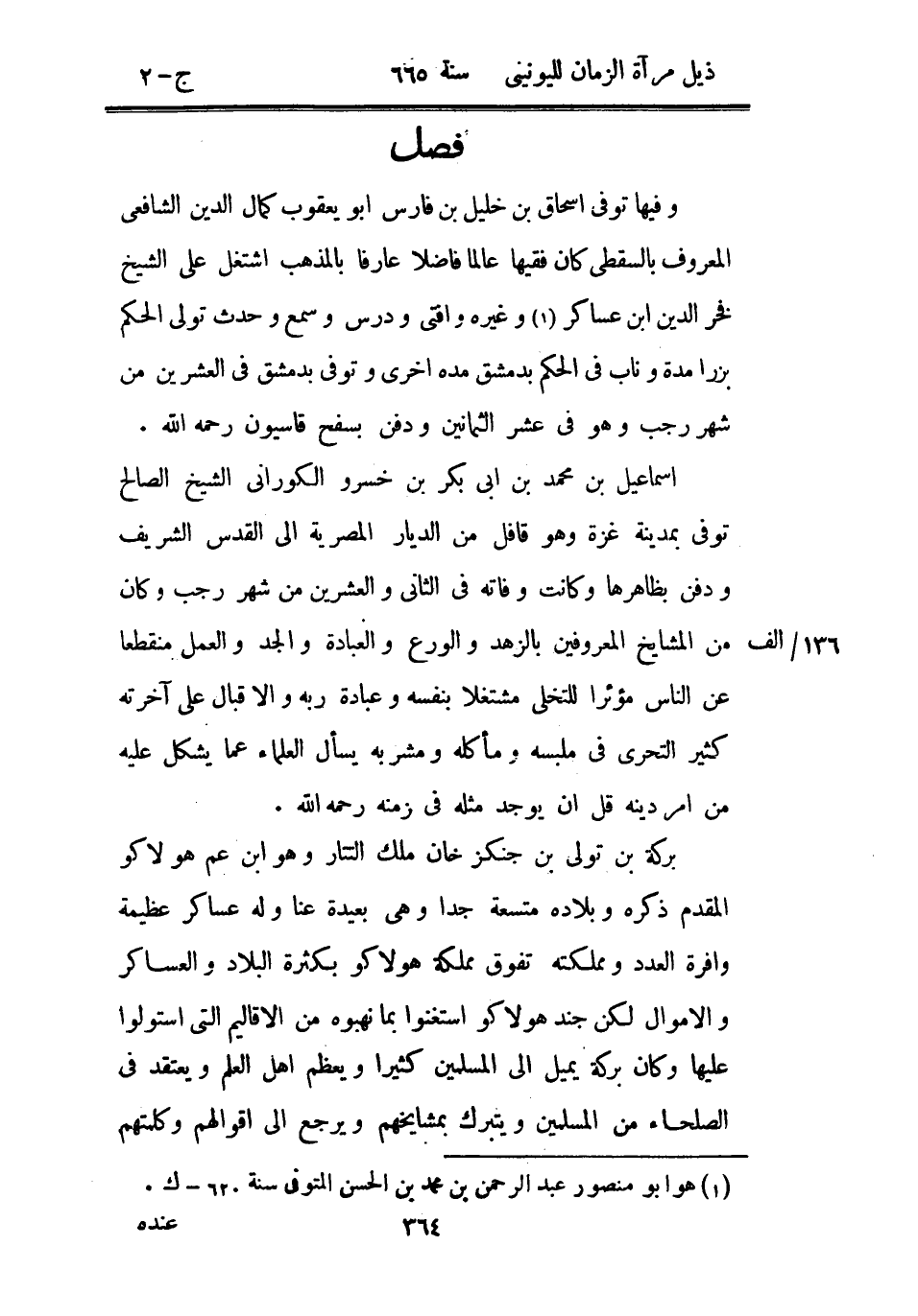بركة بن تولي بن جنكز خان ملك التتار وهو ابن عم هولاكو المقدم ذكره وبلاده متسعة جداً وهي بعيدة عنا وله عساكر عظيمة وافرة العدد ومملكته تفوق مملكة هولاكو بكثرة البلاد والعساكر والأموال لكن جند هولاكو استغنوا بما نهبوه من الأقاليم التي استولوا عليها وكان بركة يميل إلى المسلمين كثيراً ويعظم أهل العلم ويعتقد في الصلحاء من المسلمين ويتبرك بمشايخهم ويرجع إلى أقوالهم وكلمتهم