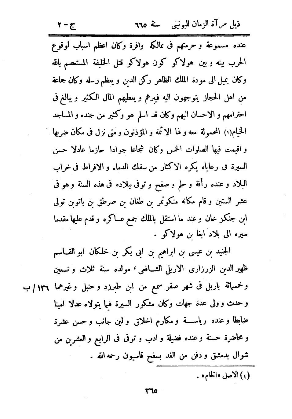 عنده مسموعة وحرمتهم في ممالكه وافرة وكان أعظم أسباب لوقوع الحرب بينه وبين هولاكو كون هولاكو قتل الخليفة المستعصم بالله ومكان يميل إلى مودة الملك الظاهر ركن الدين ويعظم رسله وكان جماعة من أهل الحجاز يتوجهون إليه فيبرهم ويعطيهم المال الكثير ويبالغ في احترامهم والإحسان إليهم وكان قد أسلم هو وكثير من جنده والمساجد الخيام المحمولة معه ولها الأئمة والمؤذنون ومتى نزل في مكان ضربها وأقيمت فيها الصلوات الخمس وكان شجاعاً جواداً حازماً عادلاً حسن السيرة في رعاياه يكره الإكثار من سفك الدماء والإفراط في خراب البلاد وعنده رأفة وحلم وصفح وتوفي ببلاده في هذه السنة وهو في عشر الستين وقام مكانه منكوتمر بن طغان بن صرطق بن باتوبن تولى ابن جنكز خان وعند ما استقل بالملك جمع عساكره وقدم عليها مقدما سيره إلى بلاد أبغا بن هولاكو.